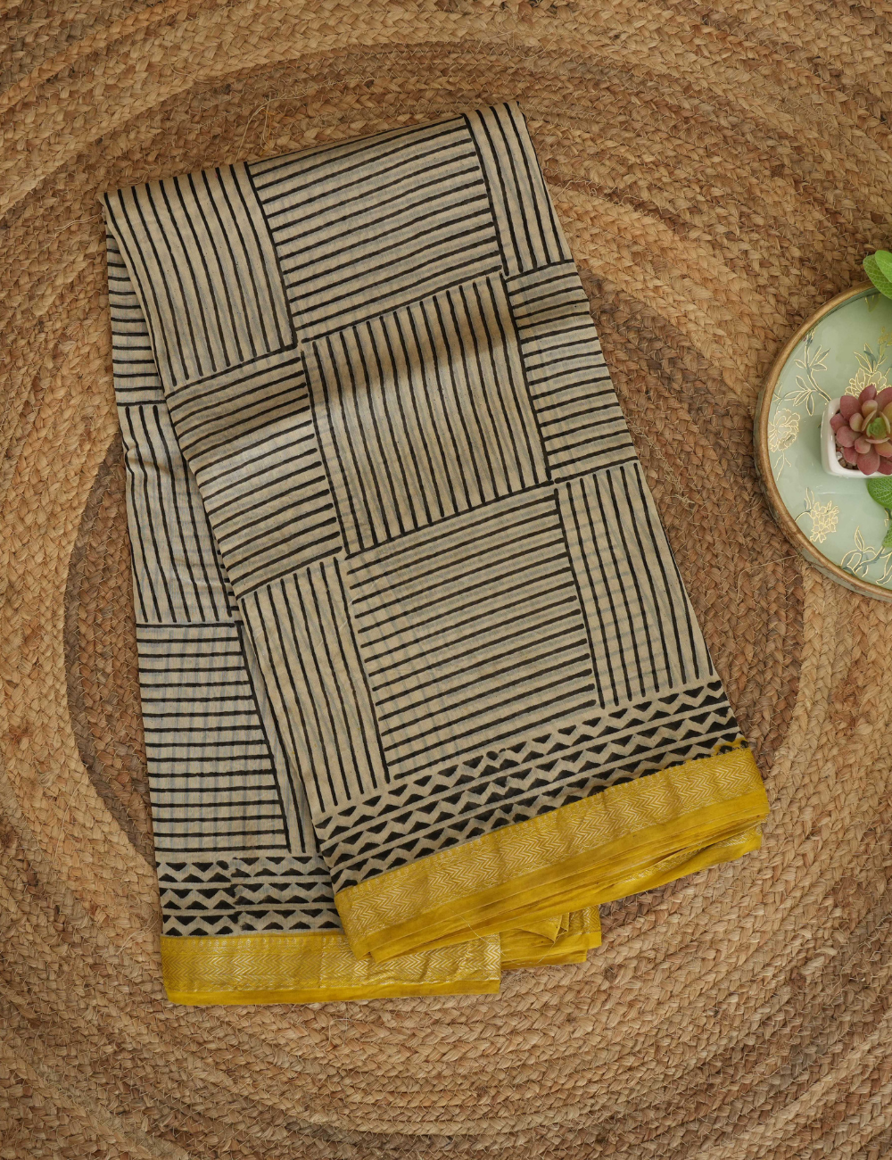 Sienna Stripes - Beige & Black - Chanderi Silk Cotton Saree