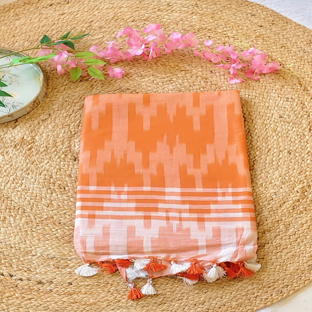 Tangerine Whisper - Ivory & Orange - Pochampally Linen Cotton Saree
