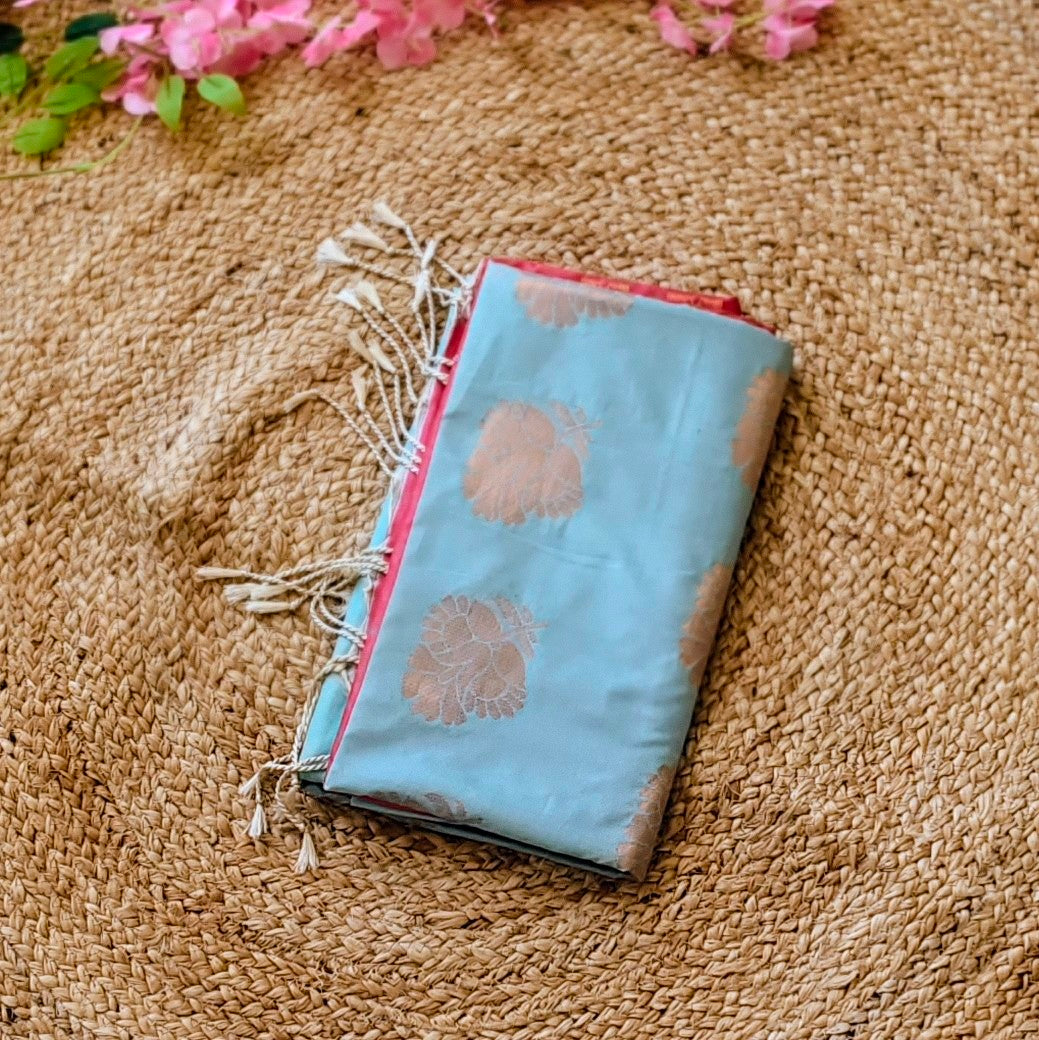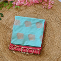 This Aqua Blue Semi-Silk Saree with Pink Pallu and Gold Zari Butta is a poetic blend of serenity and celebration, where each thread tells a story of timeless elegance. The soft, aqua blue hue evokes the calmness of a quiet ocean, while the vibrant pink pallu adds a burst of radiant energy, like the first rays of dawn breaking through a serene sky.