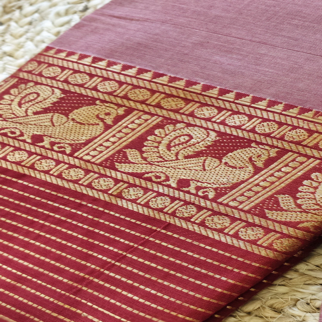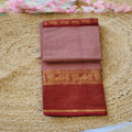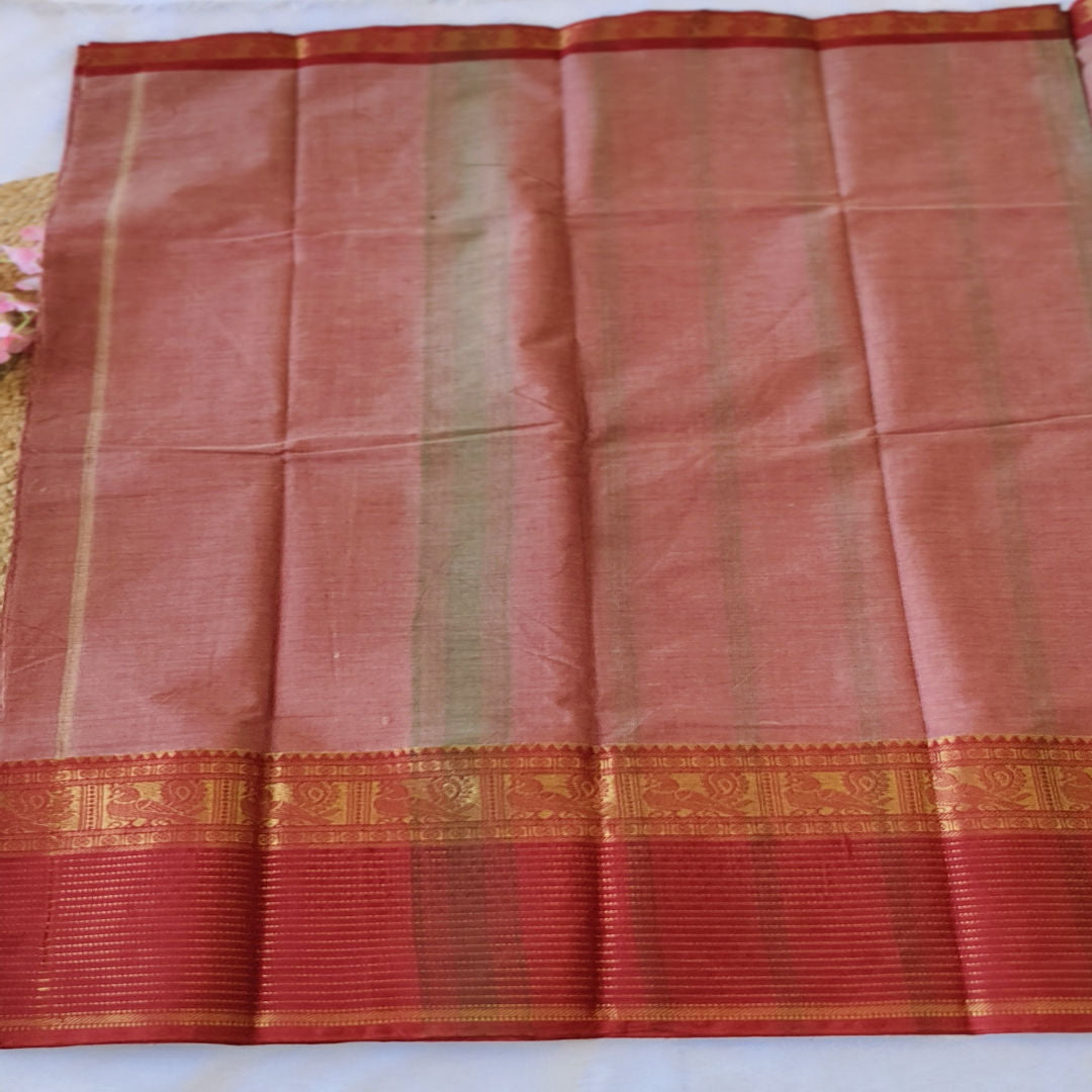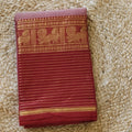 This Kanchi Cotton Saree is a timeless piece of heritage woven in every thread. Draped in a soft rose pink body, this saree is a perfect blend of elegance and understated charm. The vibrant red border is adorned with traditional geometric zari patterns and majestic yali (mythical lion-like creature) motifs, symbolising strength and grace.