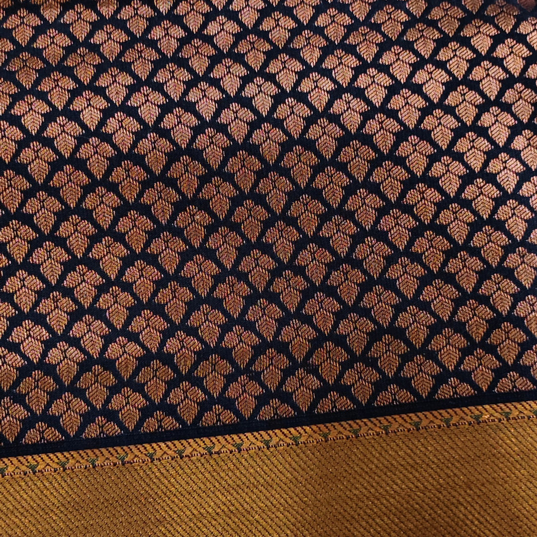 Elevate your ethnic wardrobe with this exquisite semi-silk saree featuring a rich black base adorned with copper-toned motifs, perfectly balanced by a contrasting copper zari border and pallu. The intricate design and smooth texture give it a luxurious feel while maintaining the lightness and ease of draping that semi-silk offers. Whether you're dressing up for a festive celebration or a special occasion, this saree blends traditional charm with modern elegance.