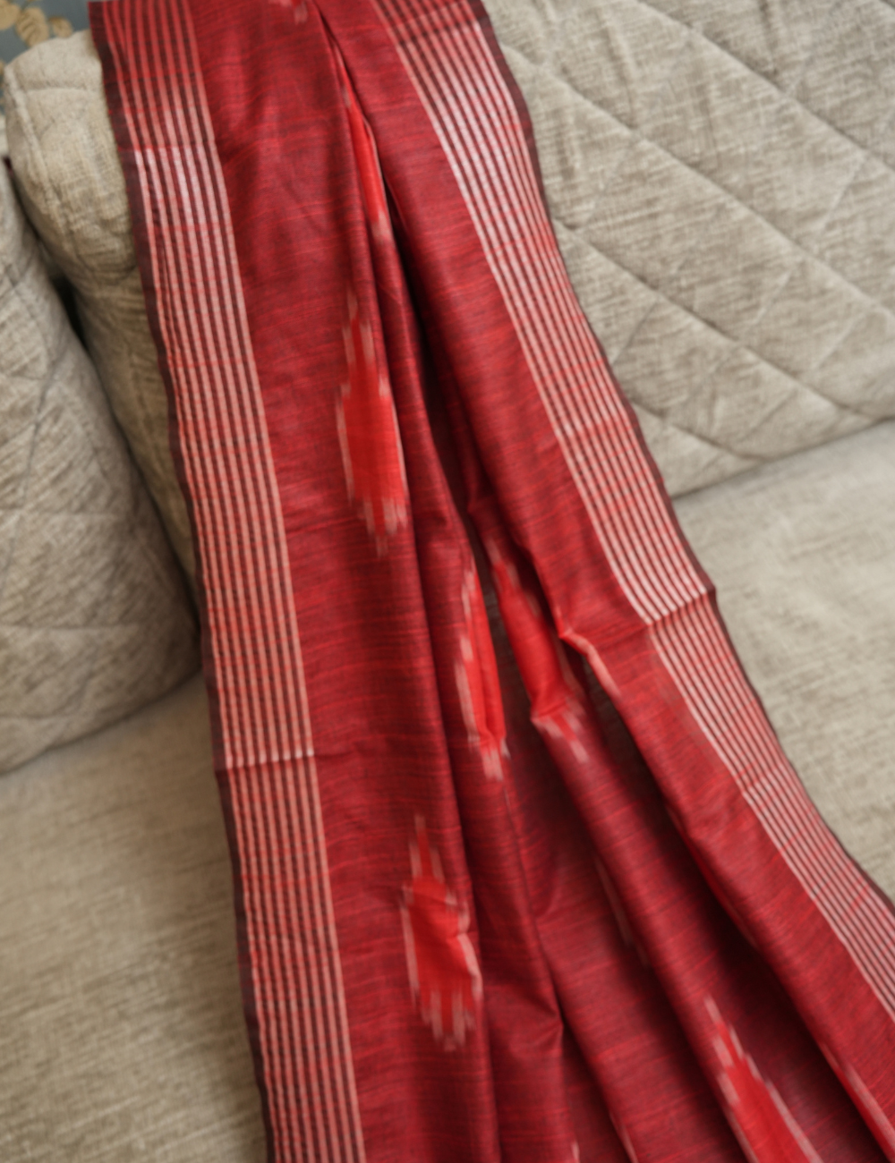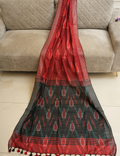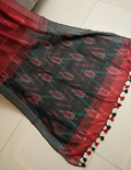 The serene maroon body of the saree is beautifully contrasted by striking red Ikat motifs, lending it a contemporary appeal. The vibrant black pallu showcases intricate geometric Ikat patterns, creating a mesmerising effect. The delicate border adds definition, while the tassels detailing enhances its charm, making it perfect for festive and casual occasions alike.