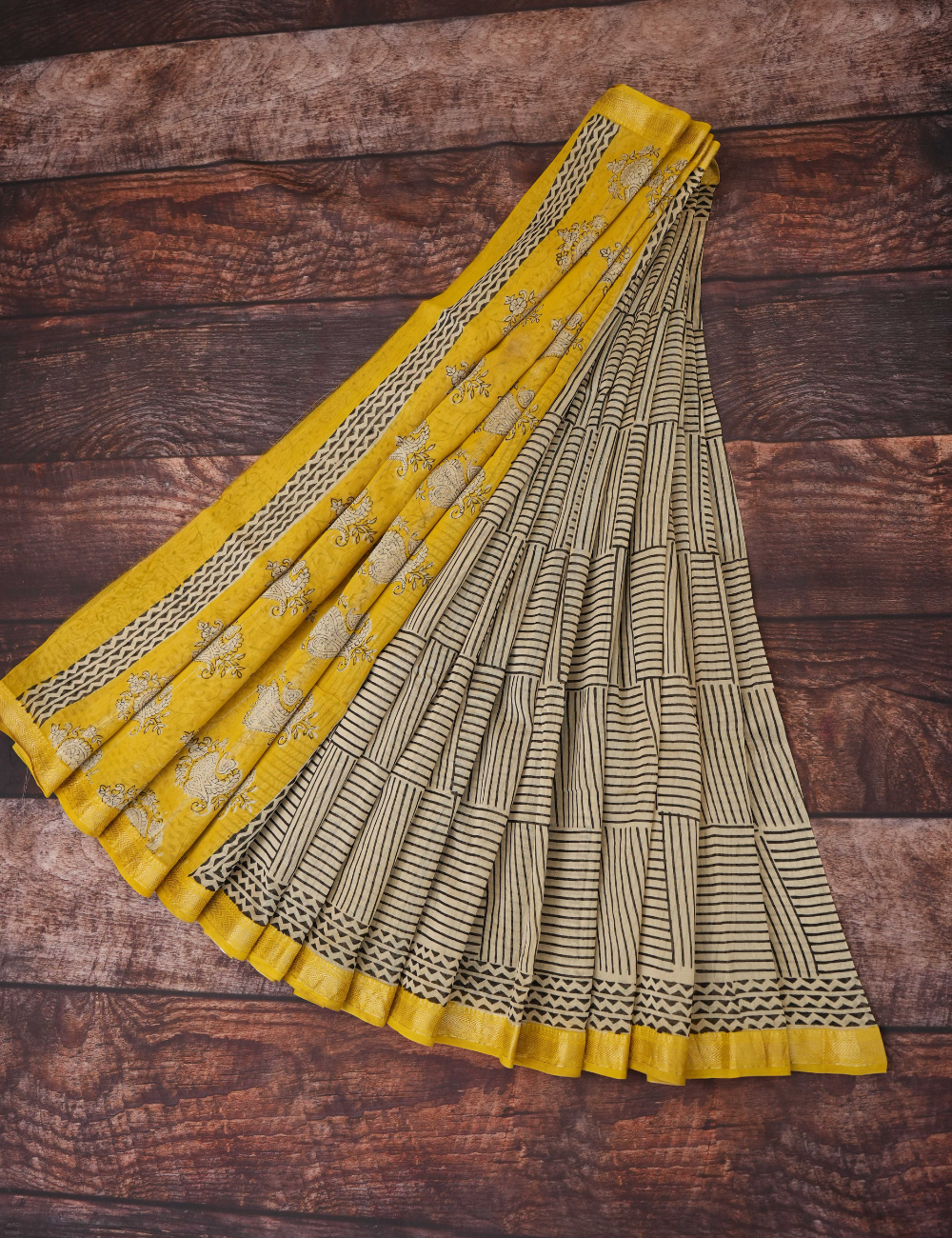 Daisy Stripes - White & Yellow - Maheshwari Silk Cotton Saree
