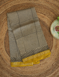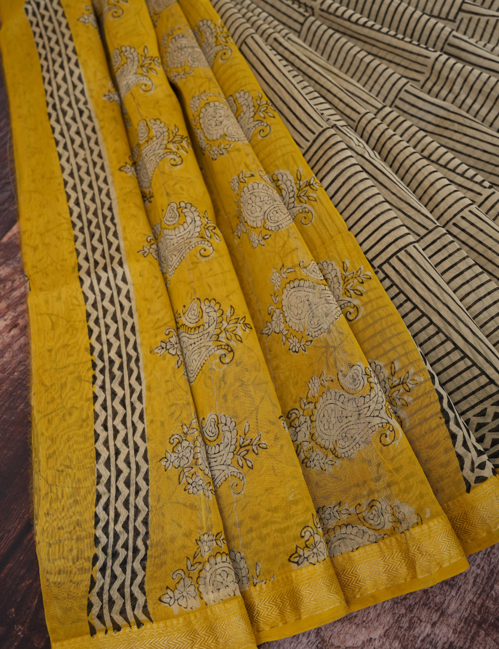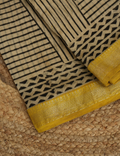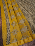 Step into contemporary elegance with our Mustard Yellow & Beige Maheshwari Silk Cotton Saree. This unique saree features a striking geometric print body with a captivating blend of traditional and modern design.