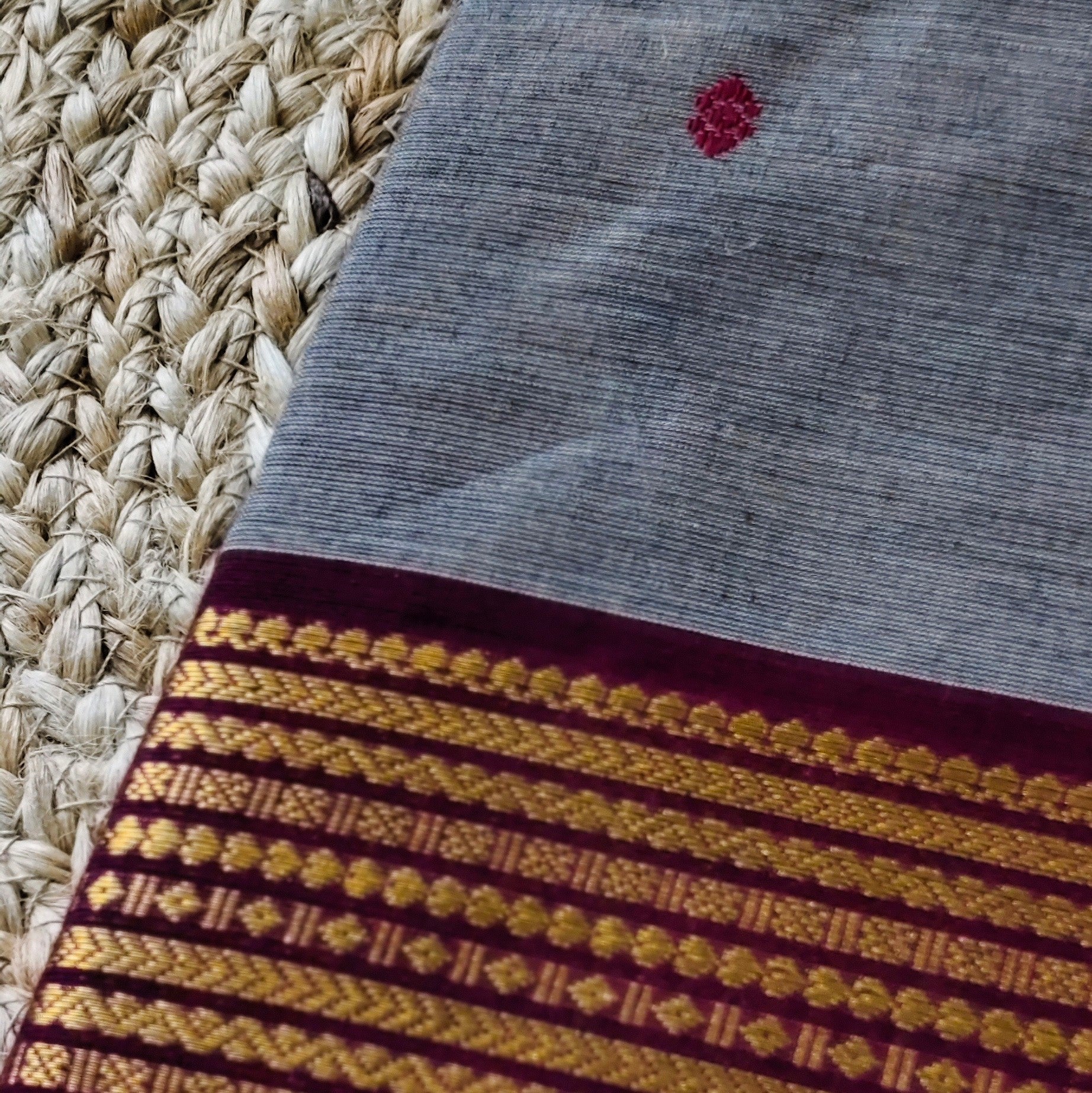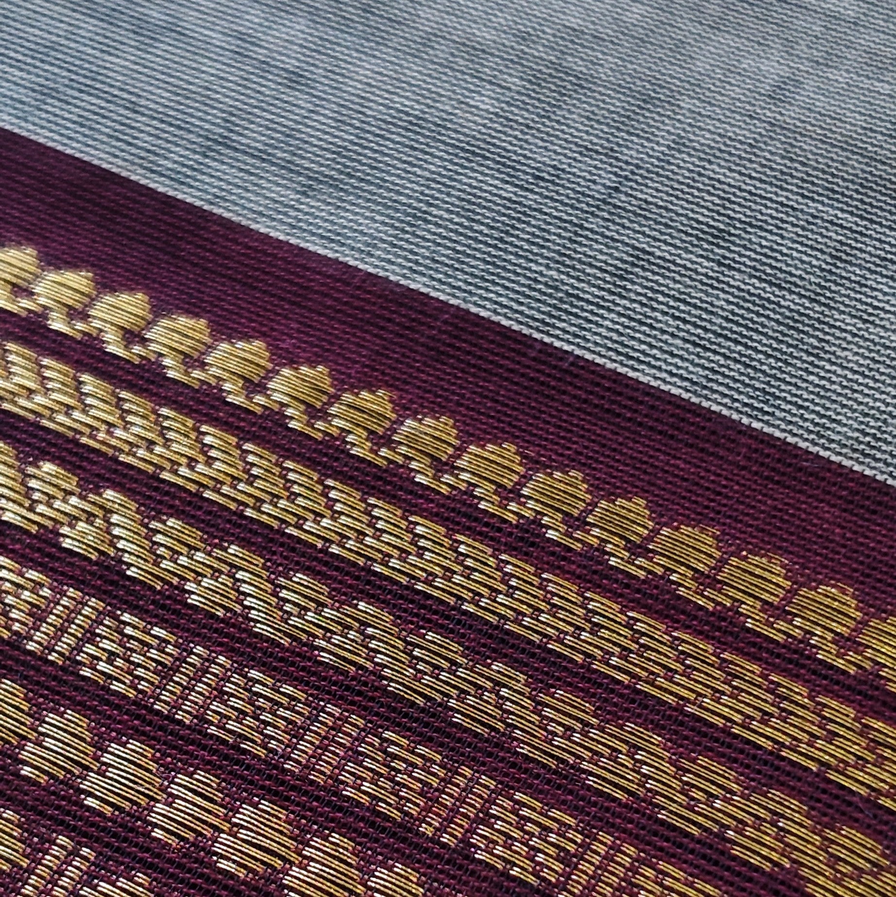 The saree is framed by a rich maroon border, which contrasts beautifully with the soft grey base, further accentuating the woven motifs. The border is intricately embellished with shimmering gold zari work, which brings a regal glow to the saree. The delicate zari patterns, woven along the maroon border, catch the light, adding a luxurious finish to the entire look.