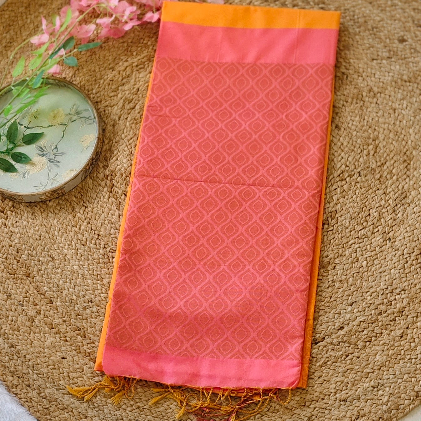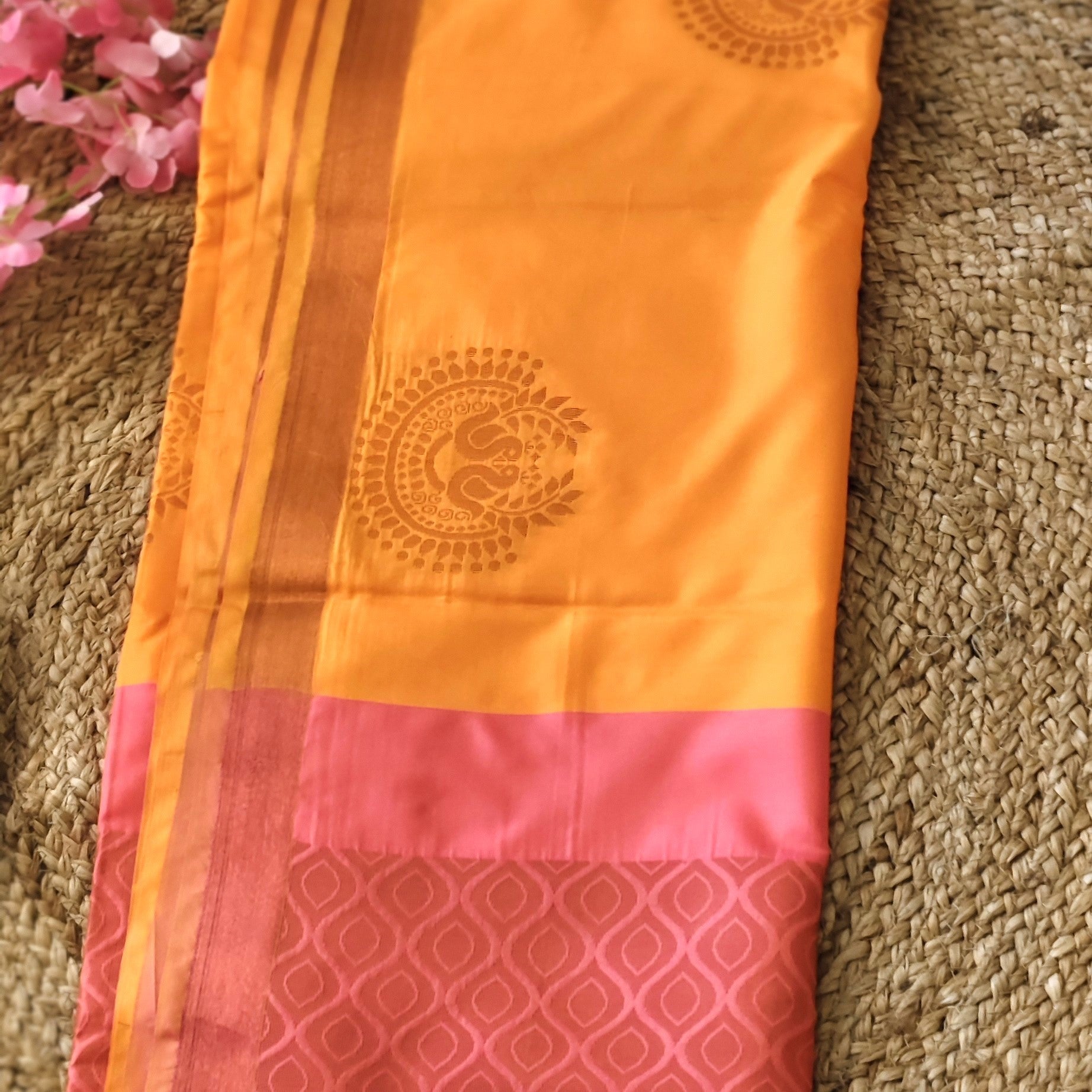 Brighten up your festive wardrobe with this stunning saree, featuring a radiant mango yellow body and a striking coral pink pallu. The vibrant mango yellow base exudes warmth and joy, while the rich coral pink pallu adds a beautiful contrast, creating a harmonious balance of color that’s perfect for celebrations and special occasions.