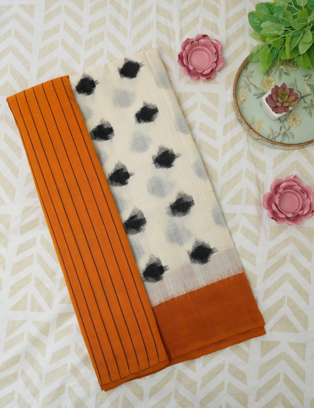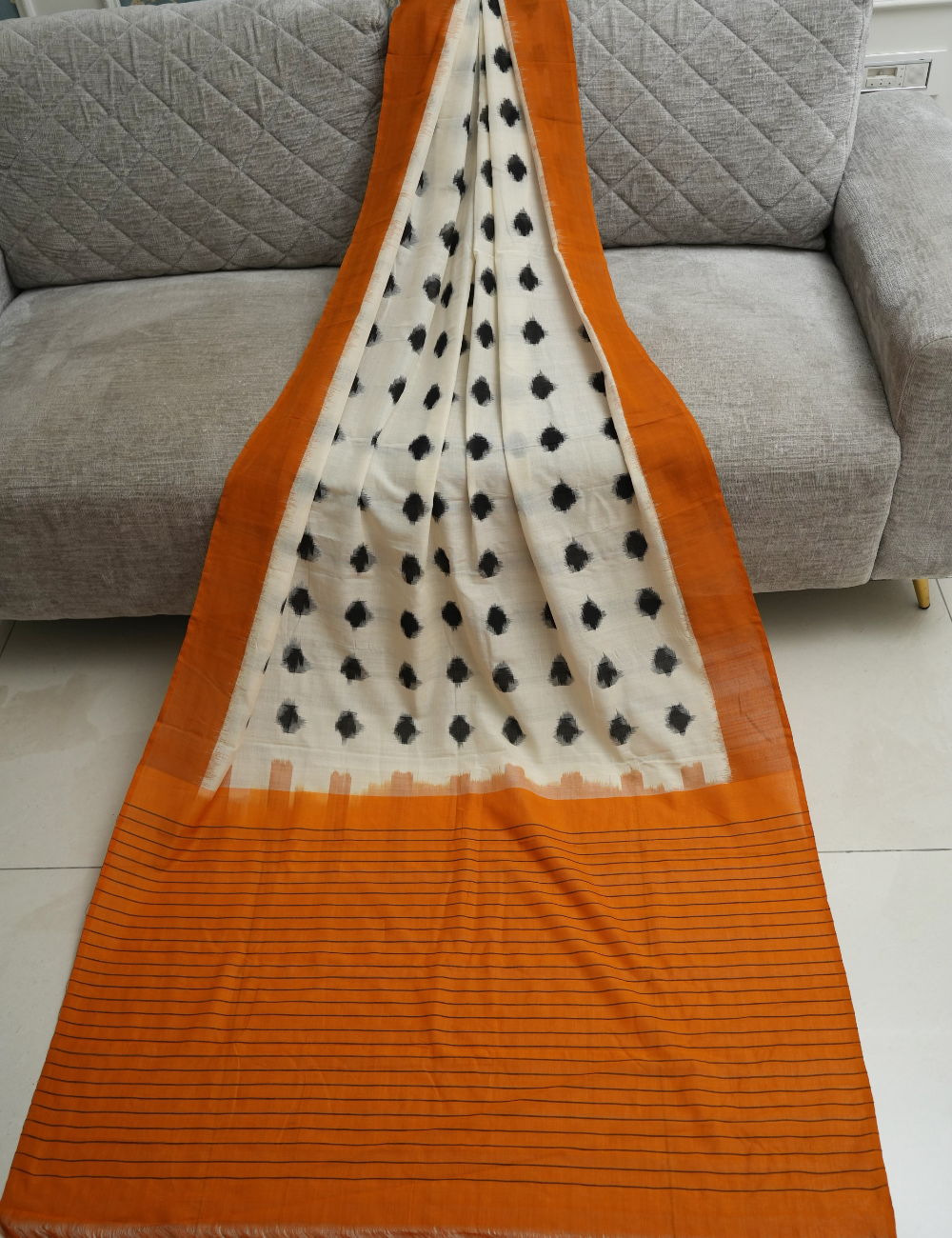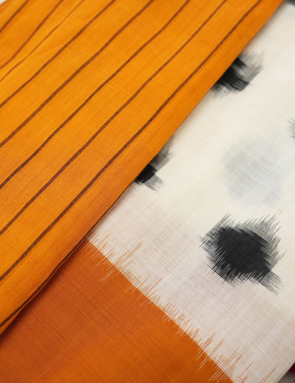 Step into the world of timeless elegance with this stunning Pochampally handloom cotton saree, crafted with the finest Double Ikat weave. The saree features a pristine white body, beautifully contrasted by a rich mustard pallu and border, creating a striking yet graceful appeal. Delicate black lines on the pallu add a touch of sophistication, making this saree a perfect blend of tradition and contemporary charm.