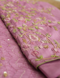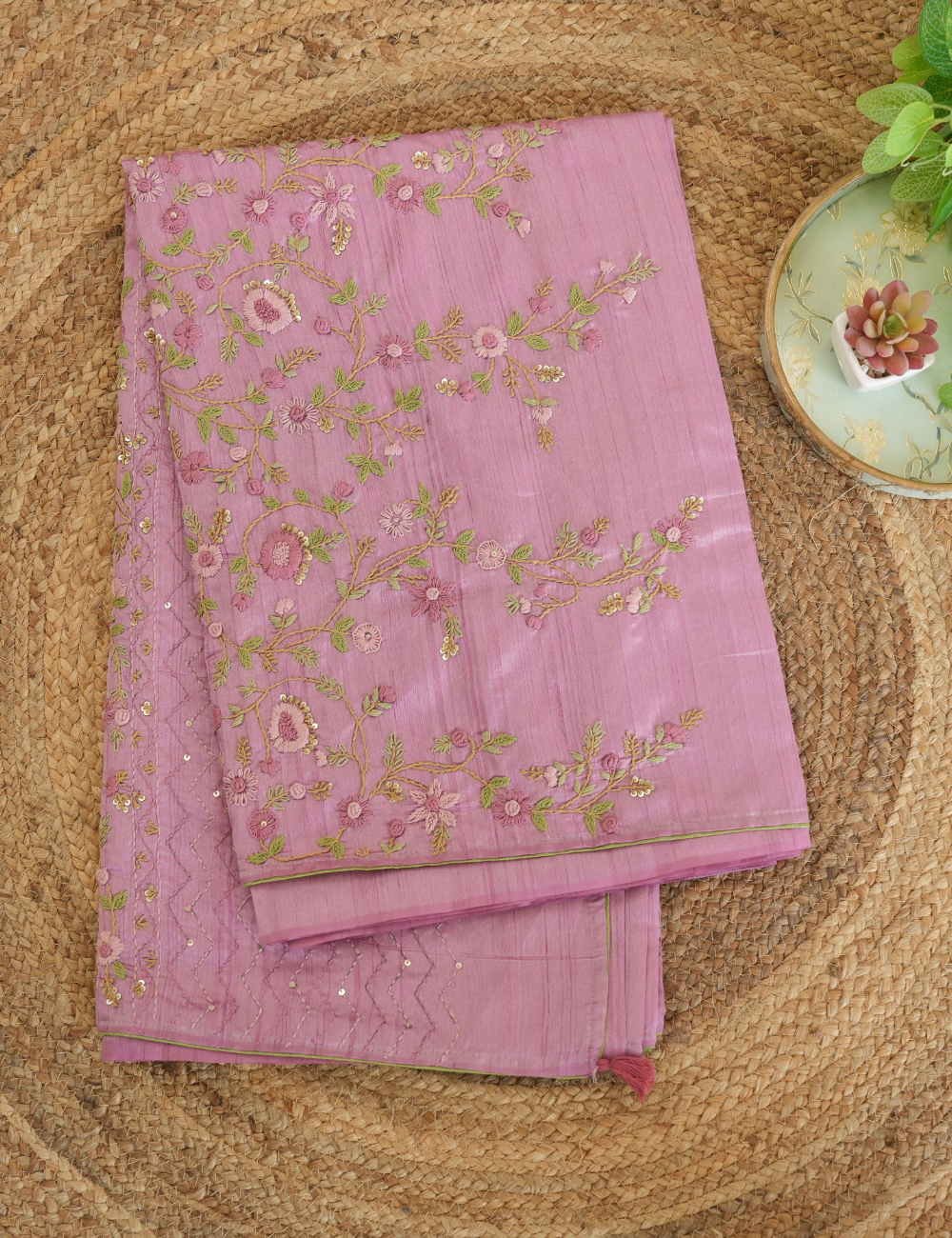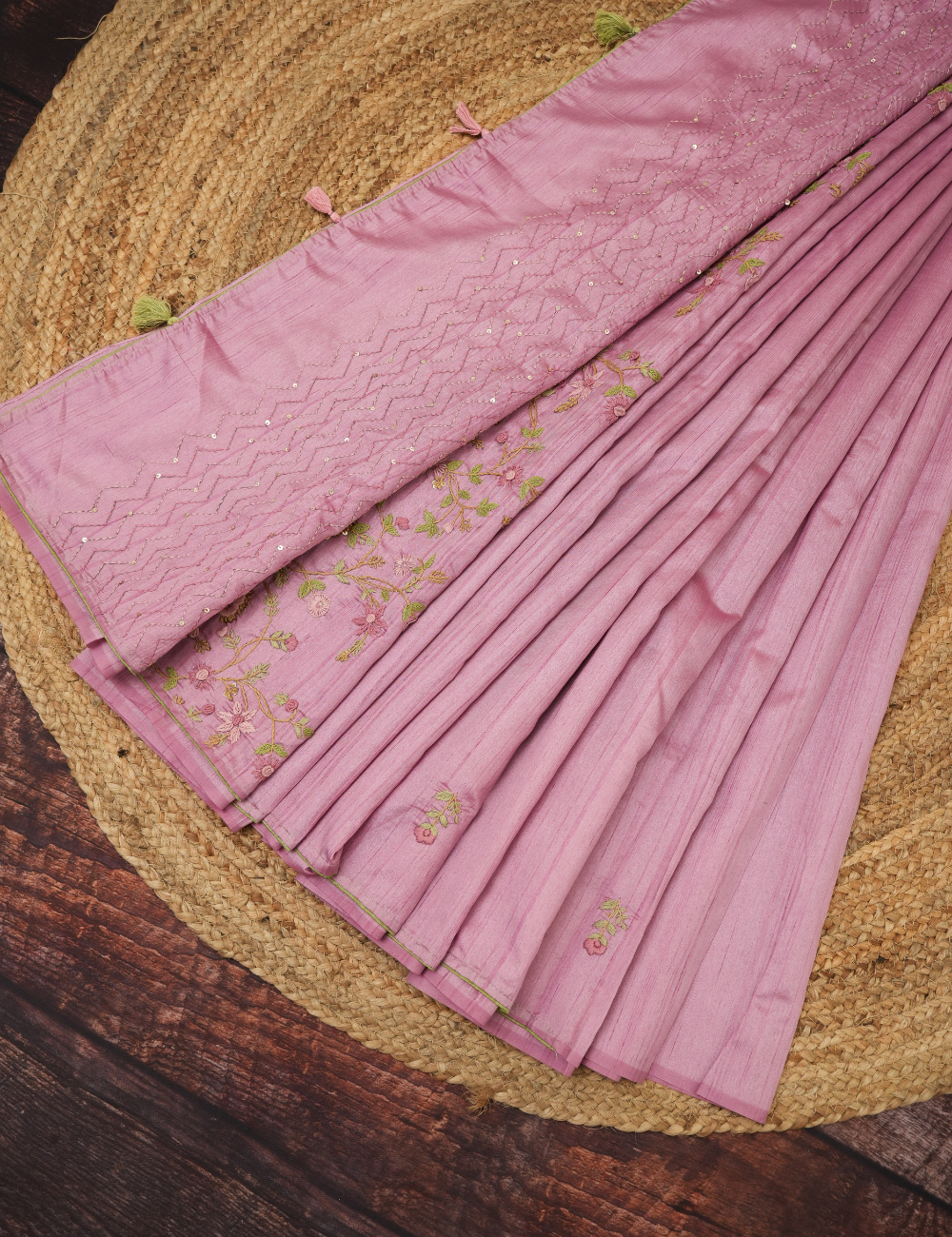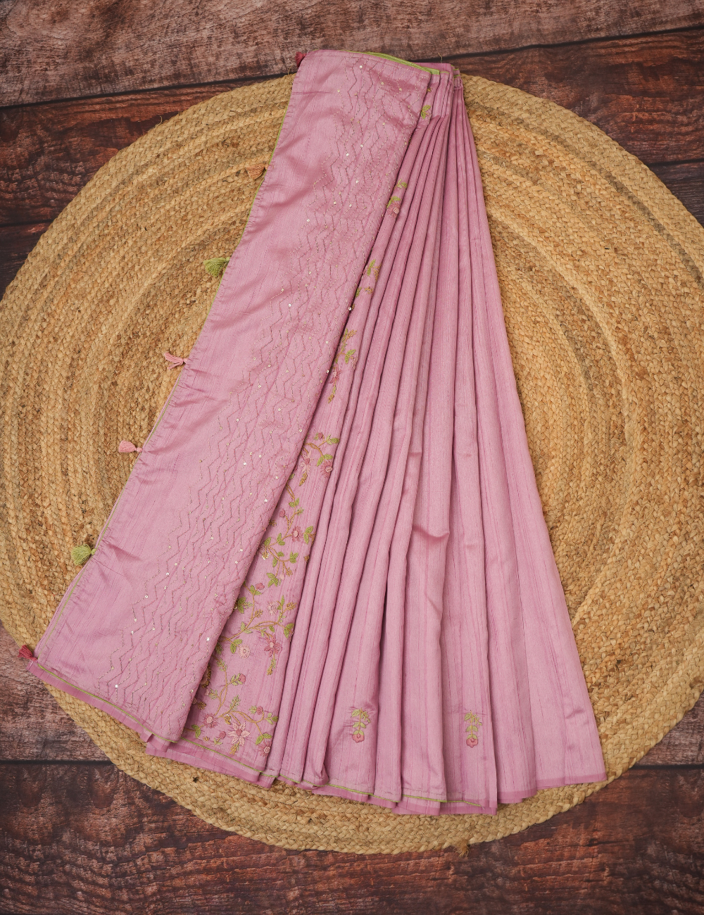 Discover the delicate charm of our Pink Semi Tussar Silk Saree. This saree showcases the subtle sheen and earthy texture of Tussar silk, elevated by exquisite hand-embroidered floral motifs. The intricate detailing, featuring delicate floral embroidery and subtle sequin embellishments, creates a unique piece that whispers sophistication.