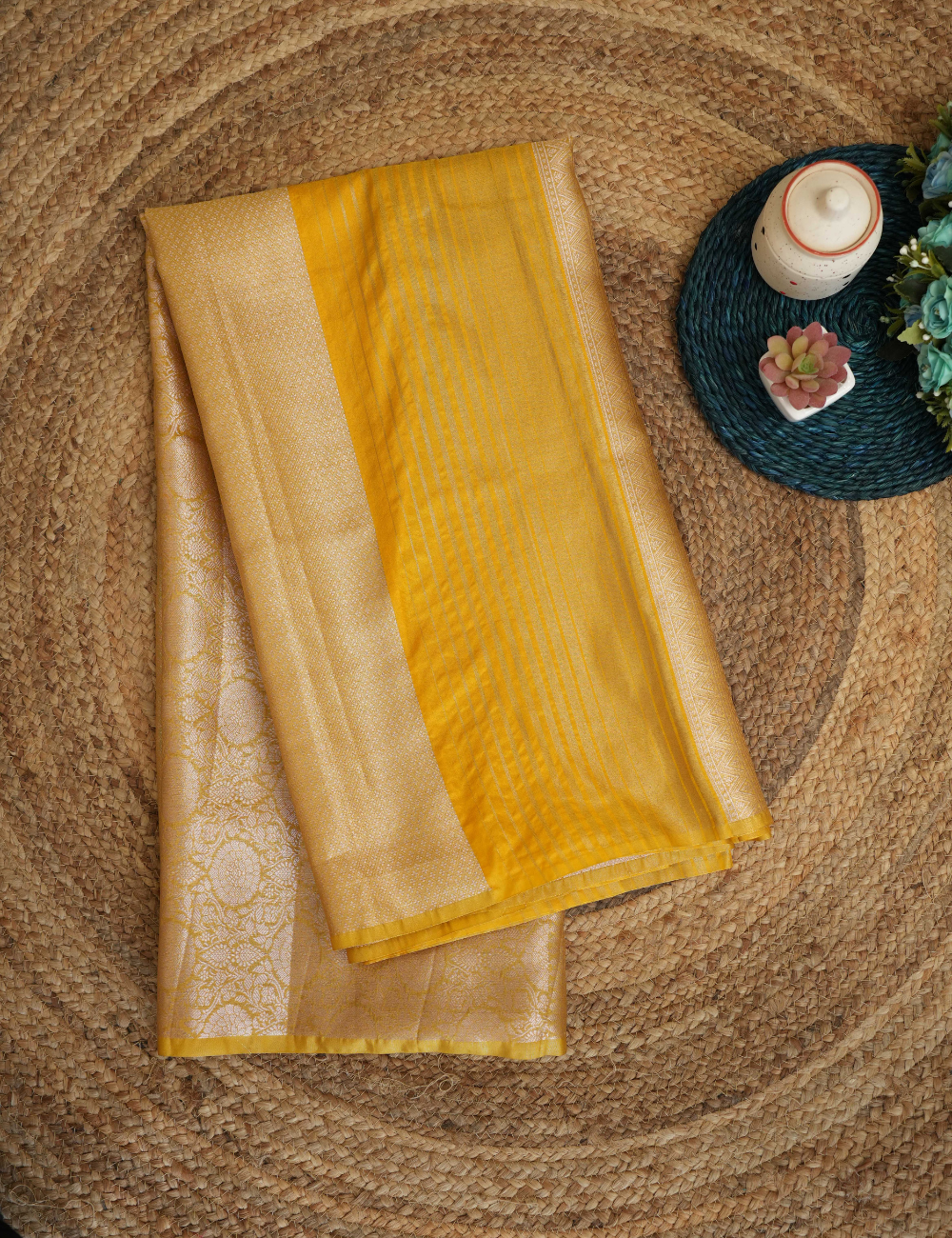 Radiate sunshine wherever you go in our Yellow & Gold Fancy Saree! This isn't just a saree; it's a statement. The unique combination of soft sunny yellow with shimmering gold accents ensures you'll stand out with effortless grace.