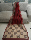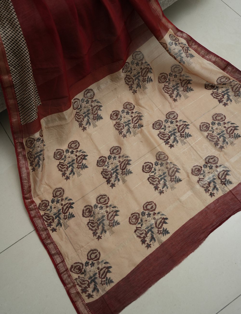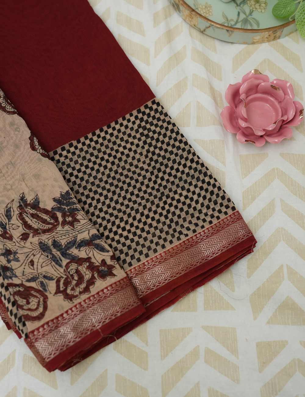 This stunning Maheshwari Silk Cotton Saree is your perfect match! The deep maroon base beautifully complements the beige pallu, adorned with intricate hand block prints of floral and vine motifs. The black checkered border adds a modern twist to this timeless design.
