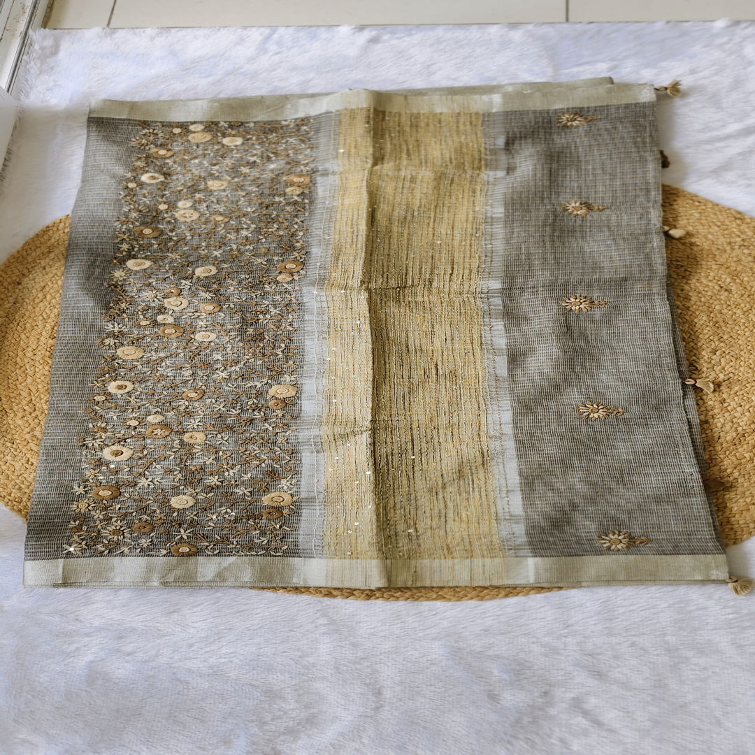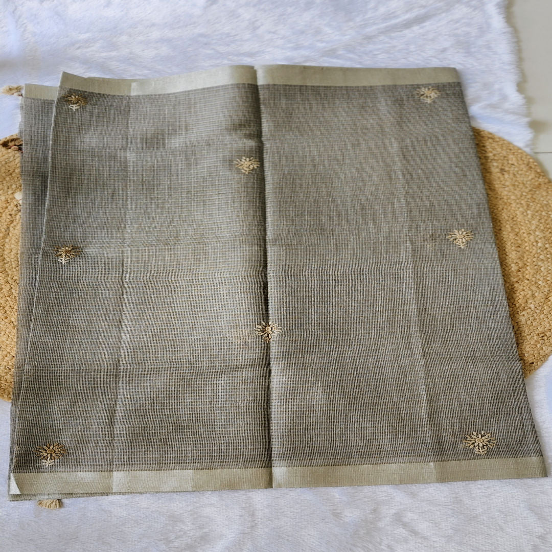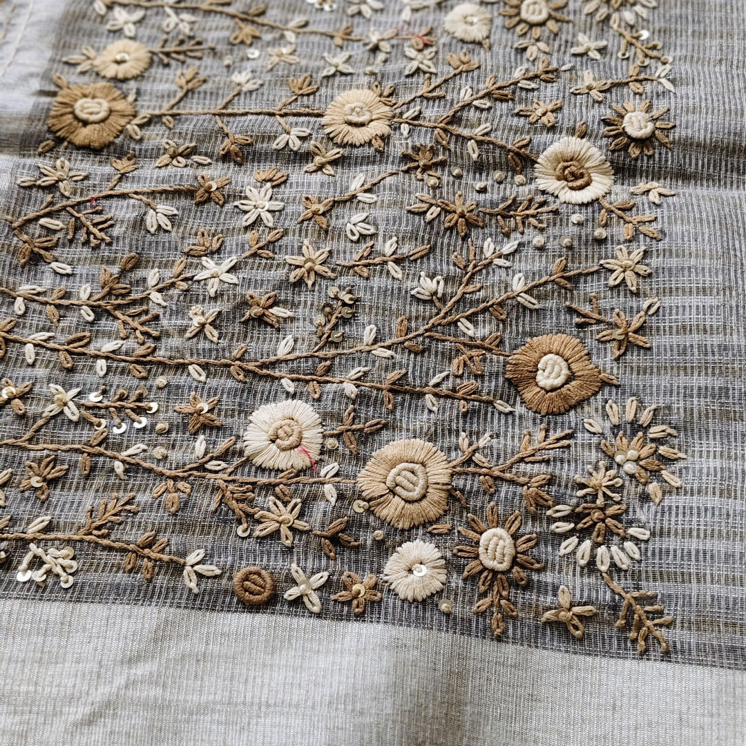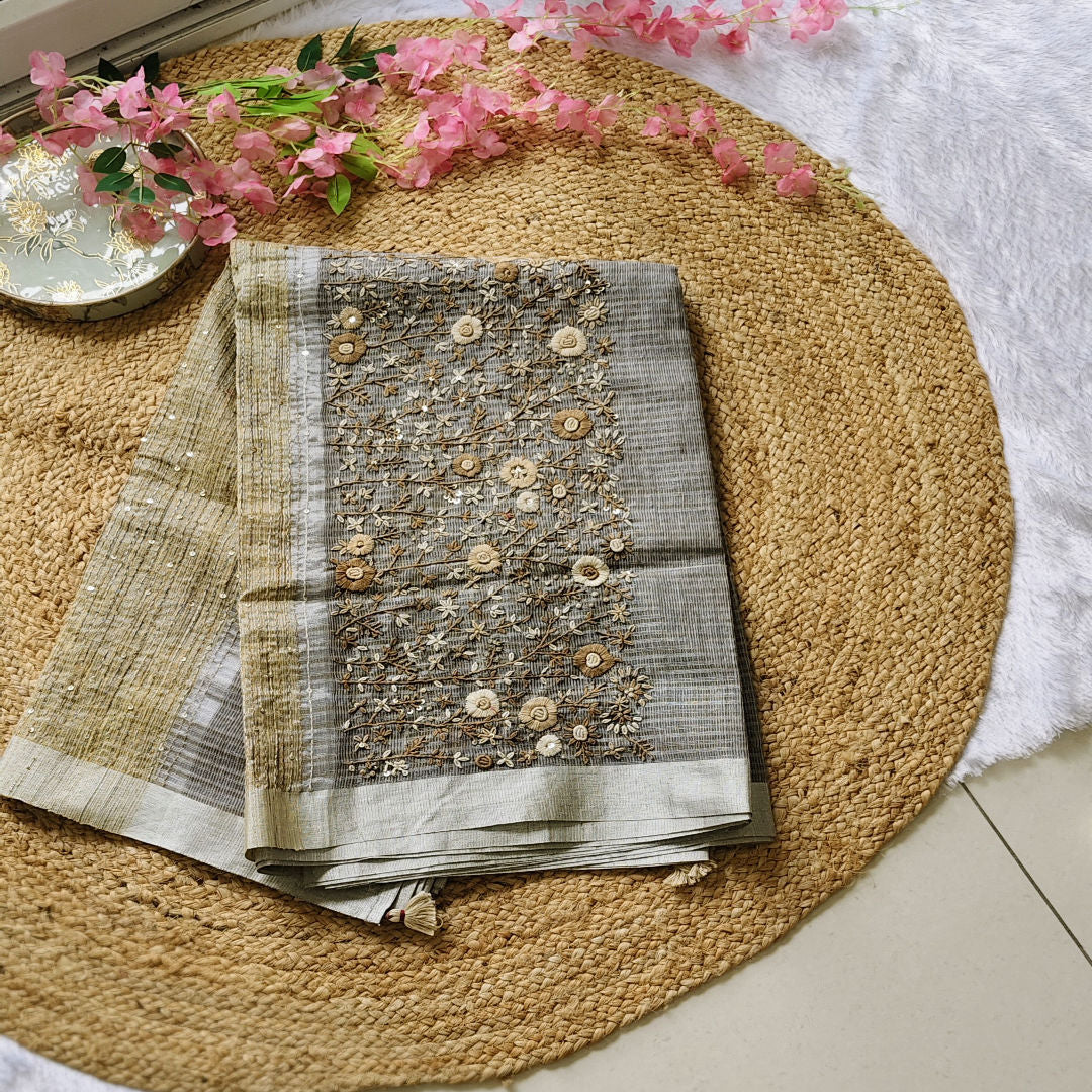 Drape yourself in timeless charm with this grey Linen Kota Saree, a blend of elegance and subtle luxury. The saree is adorned with delicate beige and brown floral hand embroidery, thoughtfully scattered across the pallu and body, adding a natural, earthy touch.