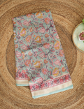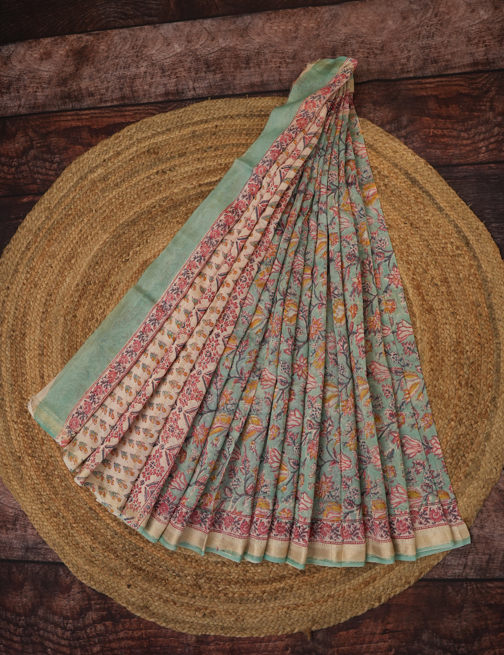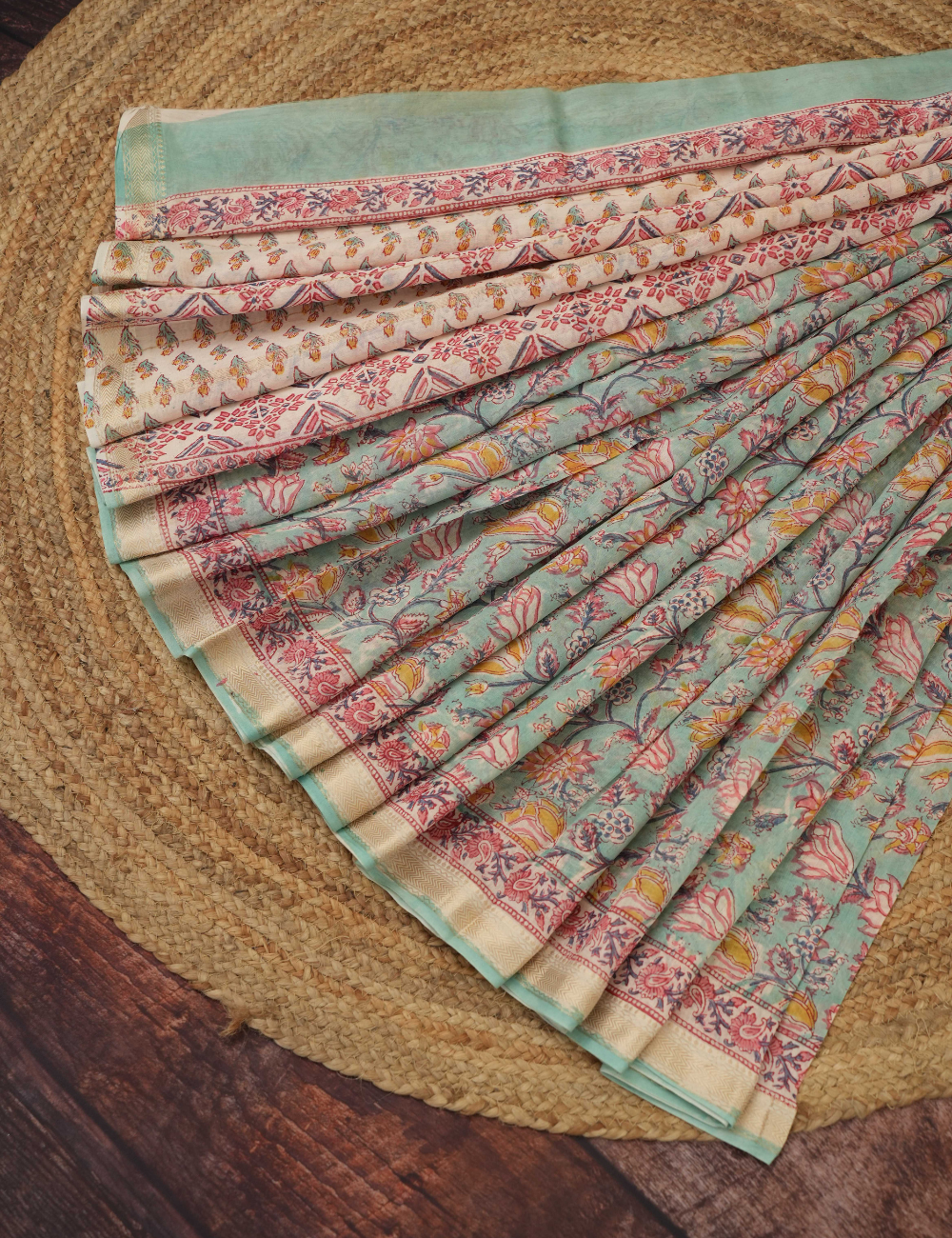 Drape yourself in sheer elegance with this exquisite Maheshwari Silk Cotton Saree, a masterpiece of fine craftsmanship. The soft sky blue base, adorned with intricate floral and paisley hand-block prints, gives it an ethereal charm. The contrast beige and red borders, highlighted with delicate detailing, add a regal touch, making this saree perfect for any occasion.
