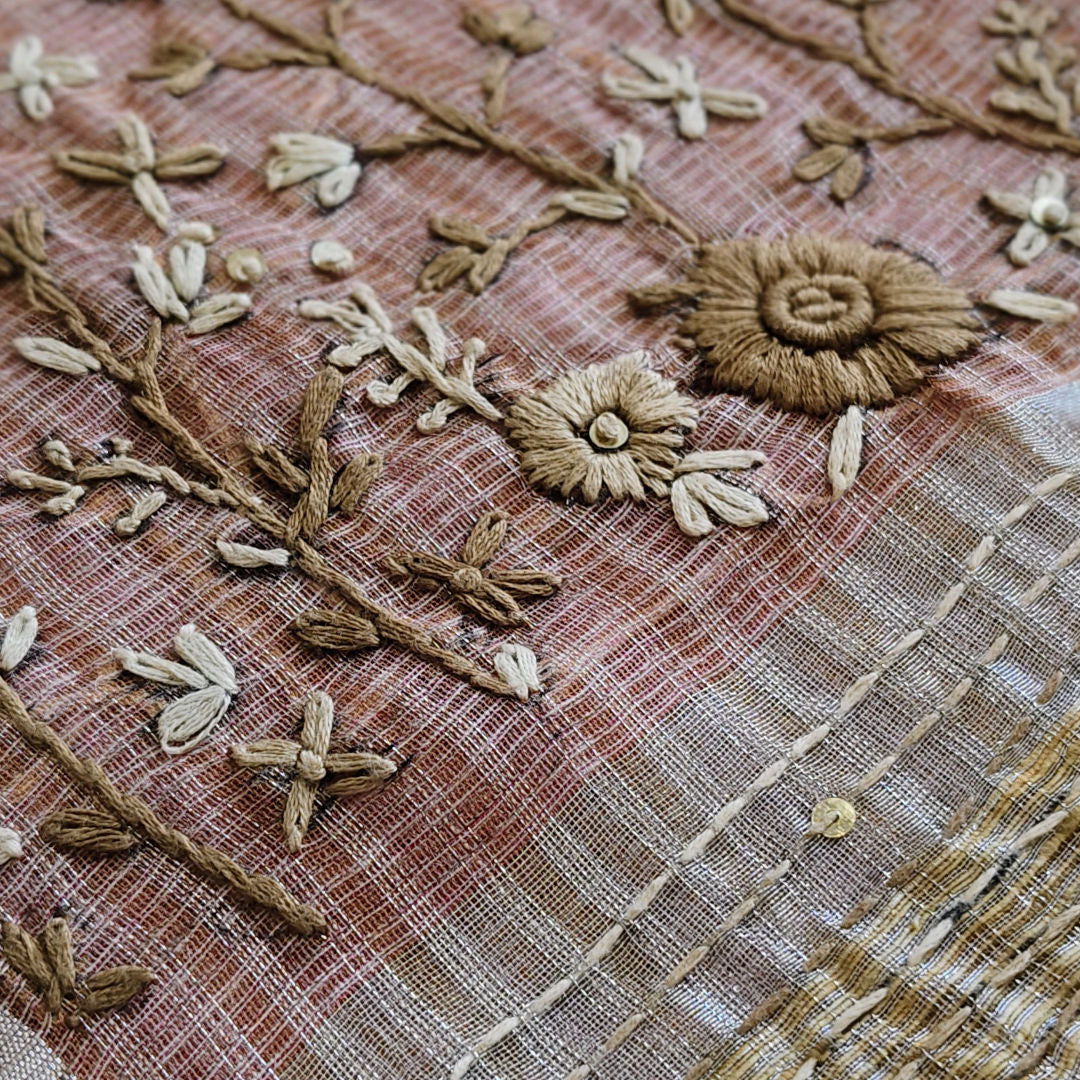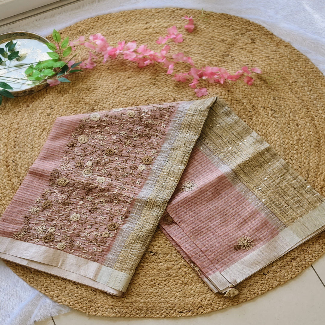 Drape yourself in timeless charm with this pink Linen Kota Saree, a blend of elegance and subtle luxury. The saree is adorned with delicate beige and brown floral hand embroidery, thoughtfully scattered across the pallu and body, adding a natural, earthy touch.
