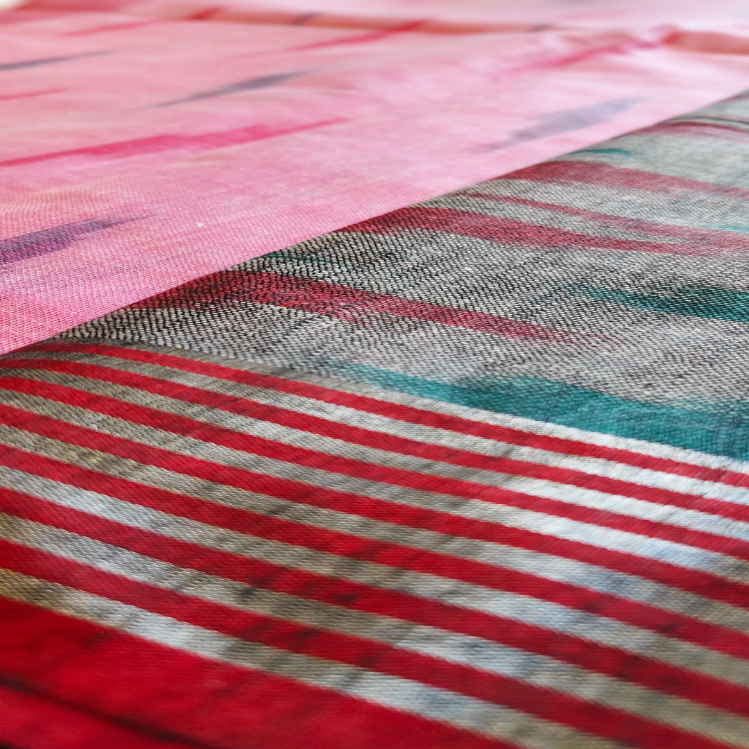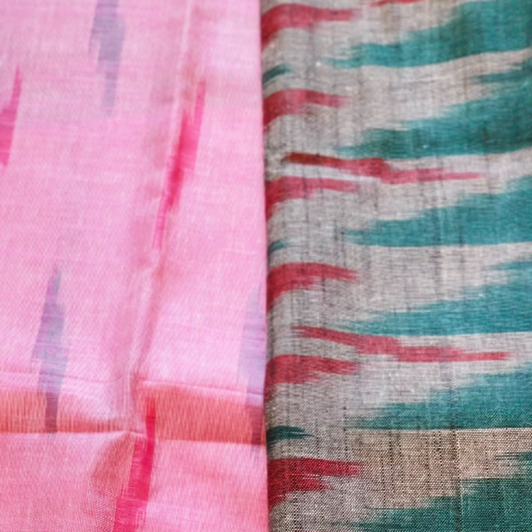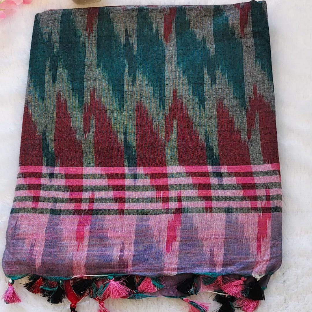 A graceful blend of tradition and modern sophistication, this Pochampally Linen Cotton saree is a dream drape for every saree connoisseur. The soft pink body, adorned with subtle ikat patterns, exudes charm and femininity, while the contrasting grey border and multicolored pallu add a striking depth to the design. The airy linen-cotton weave ensures a luxurious yet comfortable drape, perfect for festive gatherings, office wear, or casual outings.