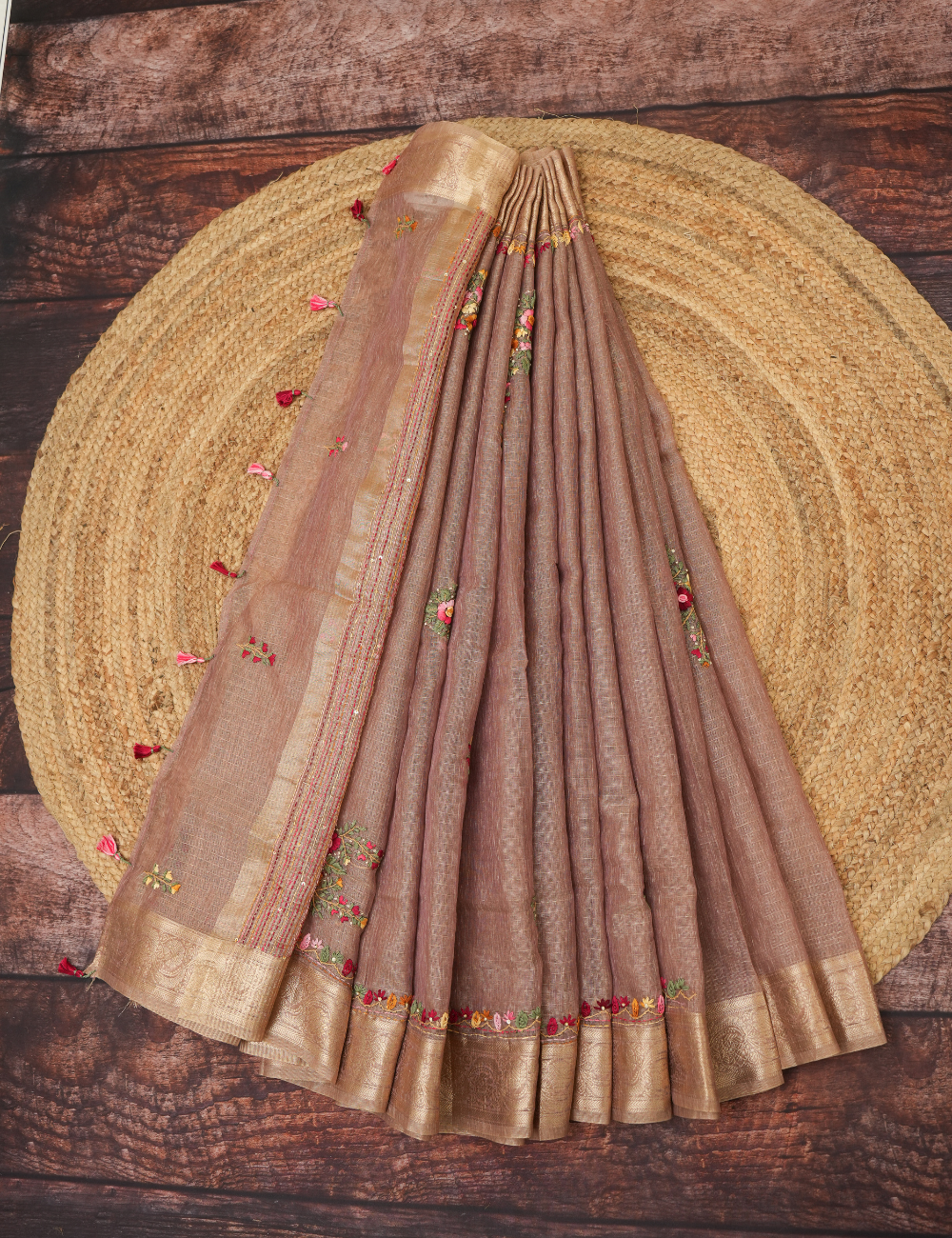 Quicksand Roses - Light Brown Tissue Linen Saree