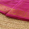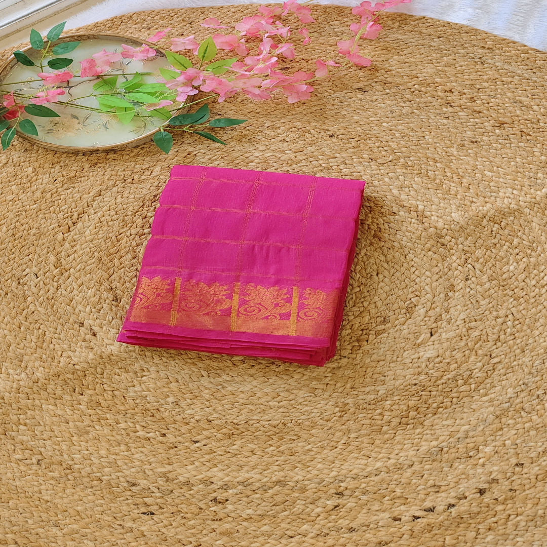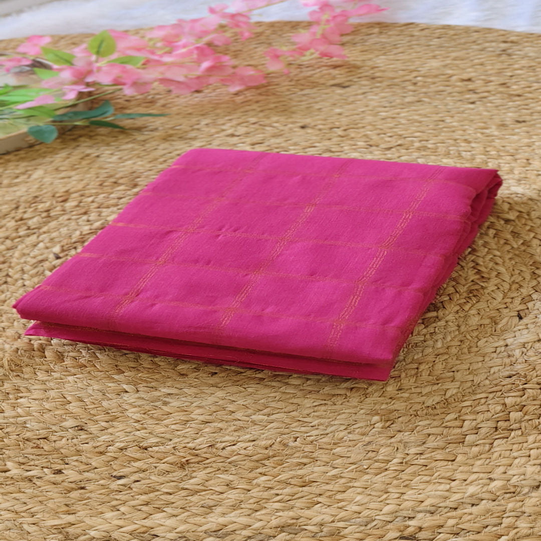 Bask in the charm of summer with this elegant pink cotton saree, delicately woven with golden checks that add a soft shimmer to its body. Crafted for comfort and timeless appeal, the saree features a matching pink pallu and a subtle zari-woven border, bringing together tradition and ease in perfect harmony.