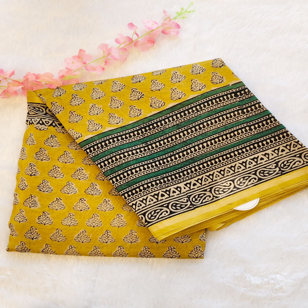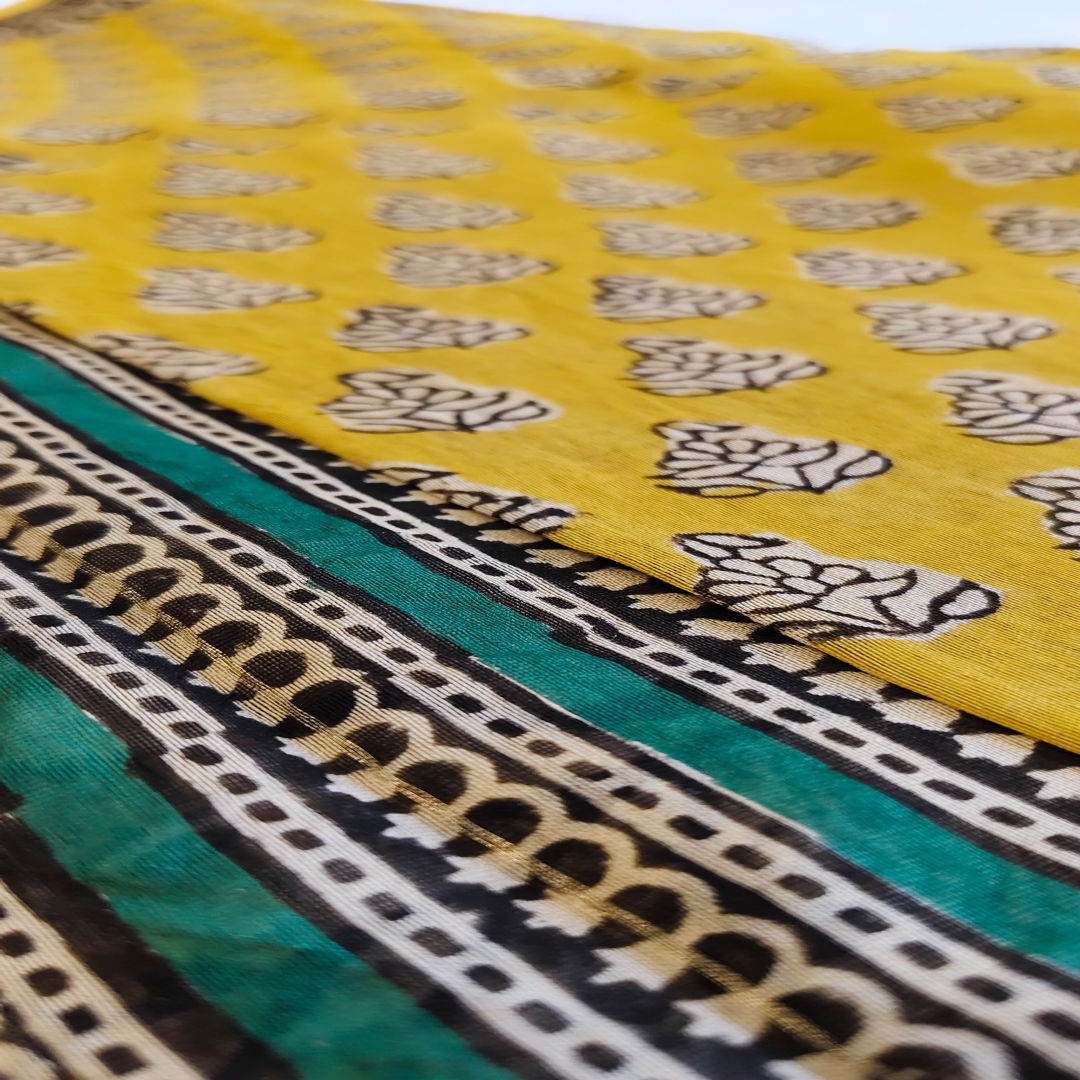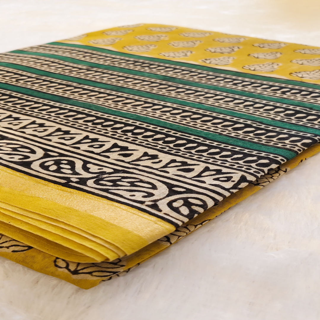 A saree that speaks heritage, elegance, and effortless grace, this Chanderi Silk Cotton drape is a perfect fusion of luxury and comfort. The vibrant yellow body, reminiscent of golden sunshine, is adorned with handblock print motifs, adding a touch of artisanal charm. The deep green border and pallu, accented with bold black handblock designs, create a stunning contrast, making this saree a true masterpiece of traditional craftsmanship. The light, airy texture ensures all-day comfort, whether you're attending a festive celebration, a cultural gathering, or a casual day out.