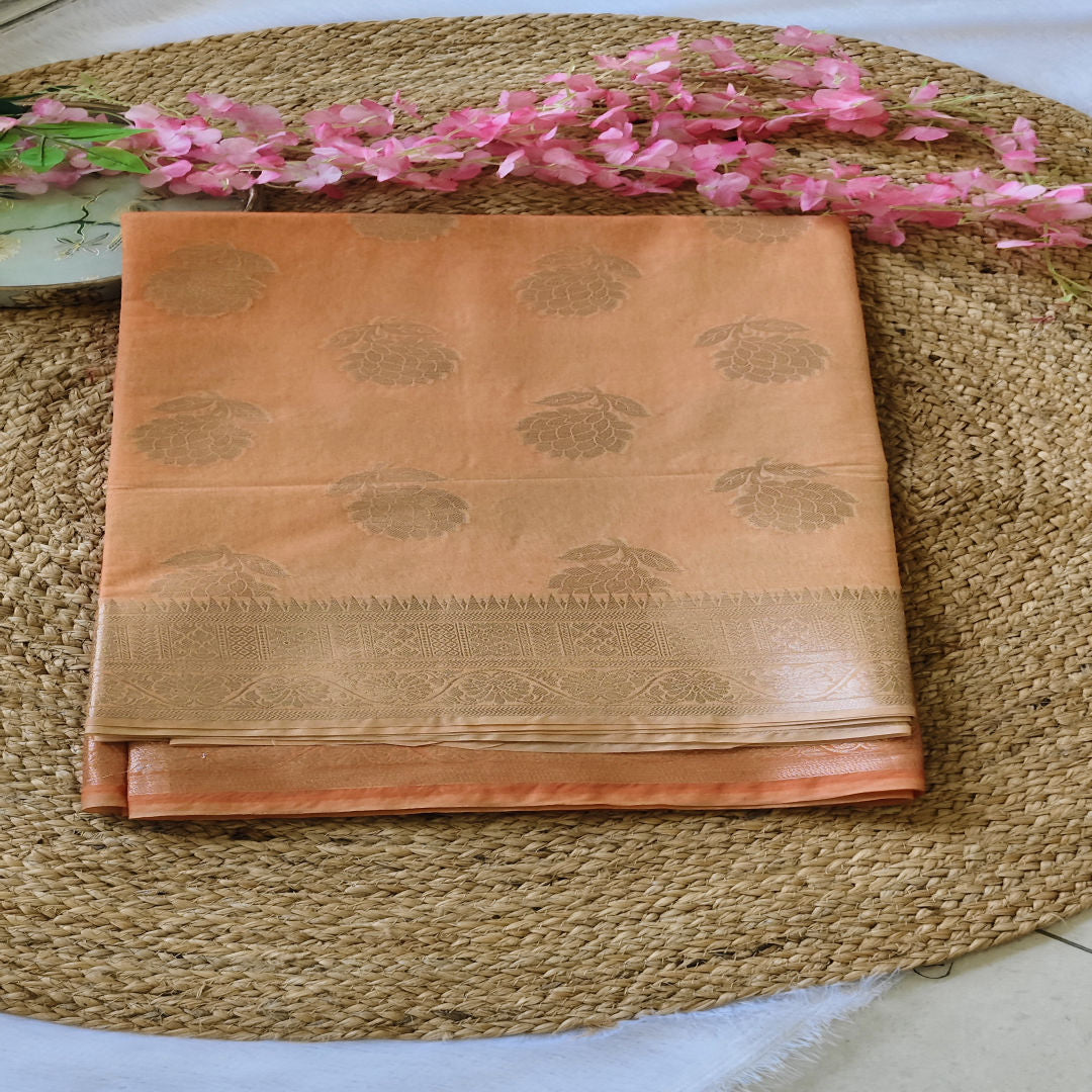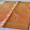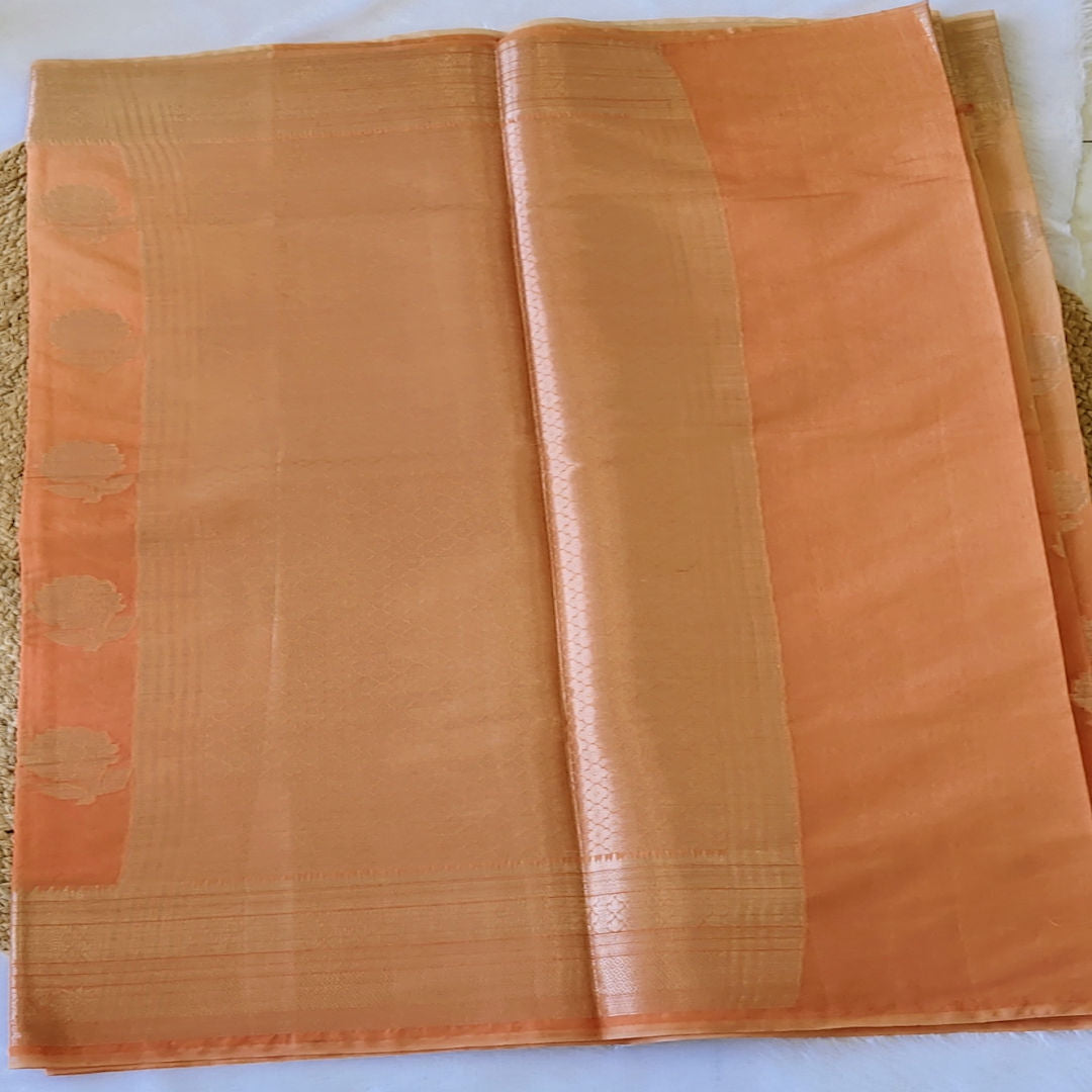 A vision of warmth and radiance, the Sunset Glow saree is a tribute to timeless beauty. The rich orange hue reflects the vibrancy of golden hour, while its delicate zari floral patterns and ornamental borders add a sophisticated sheen. The orange hue gradients from soft peach to fiery orange. Made in Raw Mango Silk, this drape offers a feather-light feel with a luxurious fall, making it an effortless statement piece.