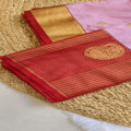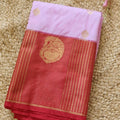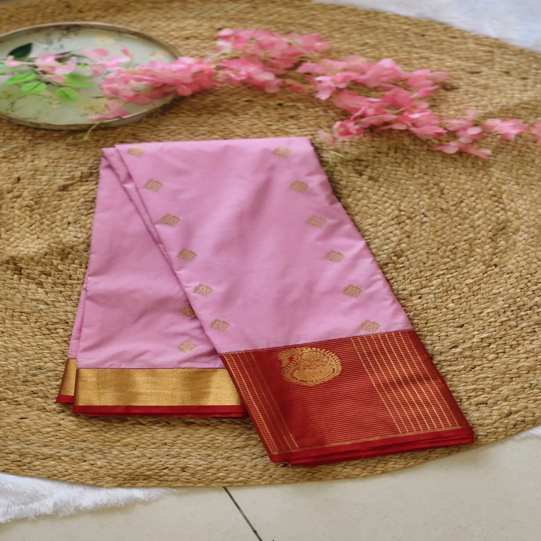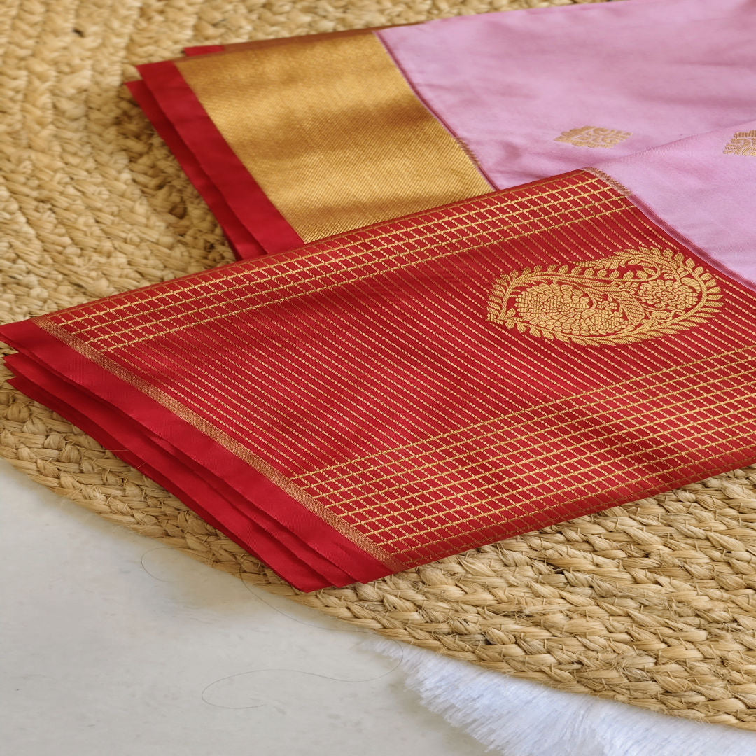 Wrap yourself in timeless grace with this exquisite Kanchi Semi-Silk Saree, a stunning blend of elegance and tradition. The saree features a soft pastel pink body that radiates subtle charm and femininity. This gentle hue is beautifully contrasted with a rich crimson pallu adorned with intricate gold zari work. The pallu showcases classic paisley and geometric motifs, enhancing its grandeur and adding a touch of regal splendour.