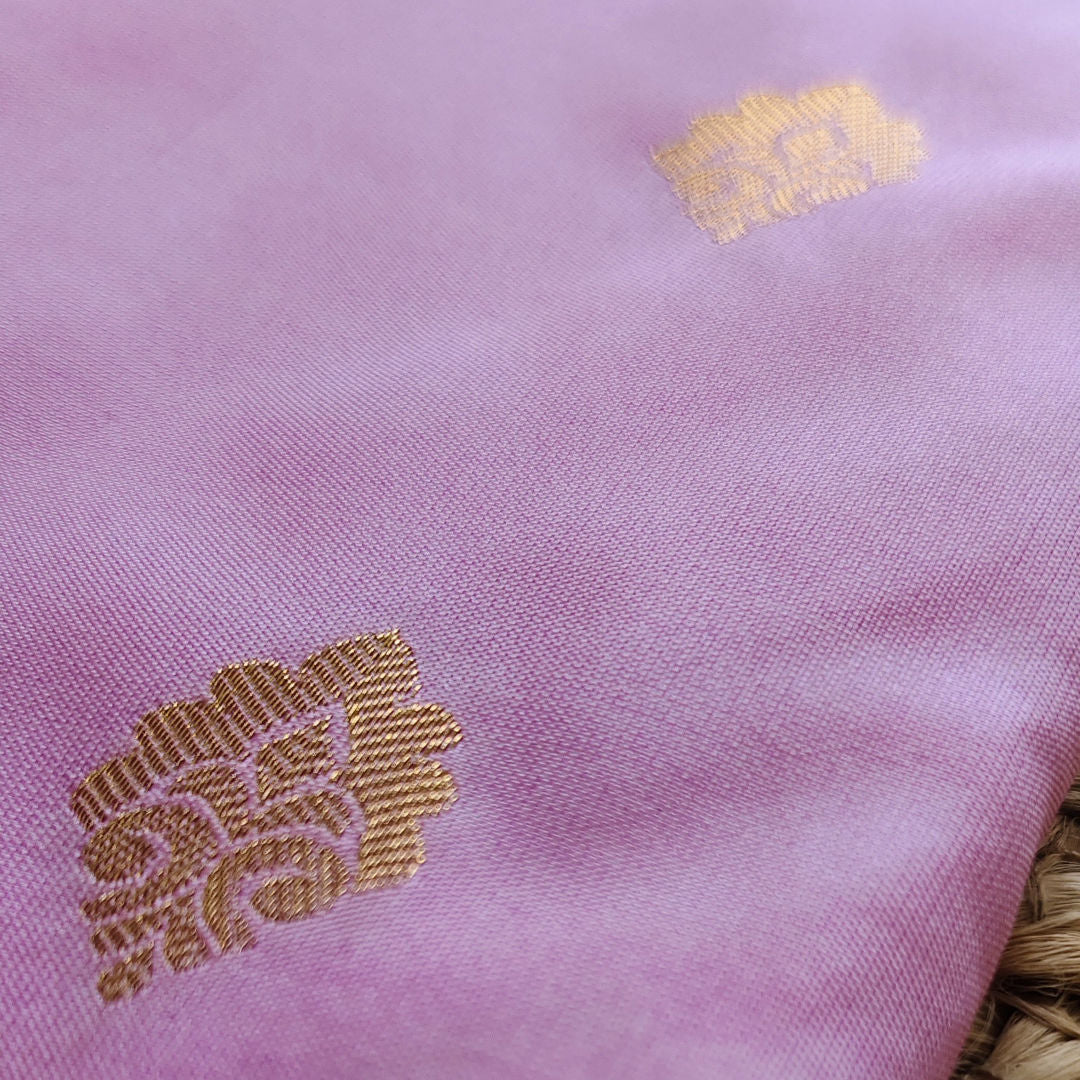 The border is woven with fine golden stripes and floral patterns, adding structure and luxury to the flowing drape. The body is delicately dotted with small golden buttas, adding just the right amount of shimmer. The semi-silk fabric gives you the luxury with the comfort of soft wearability, making it ideal for festive occasions, weddings, and traditional gatherings.