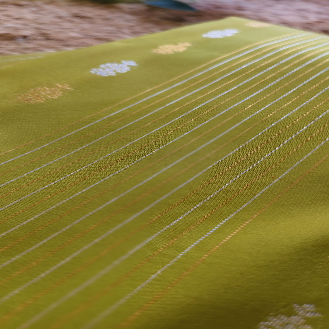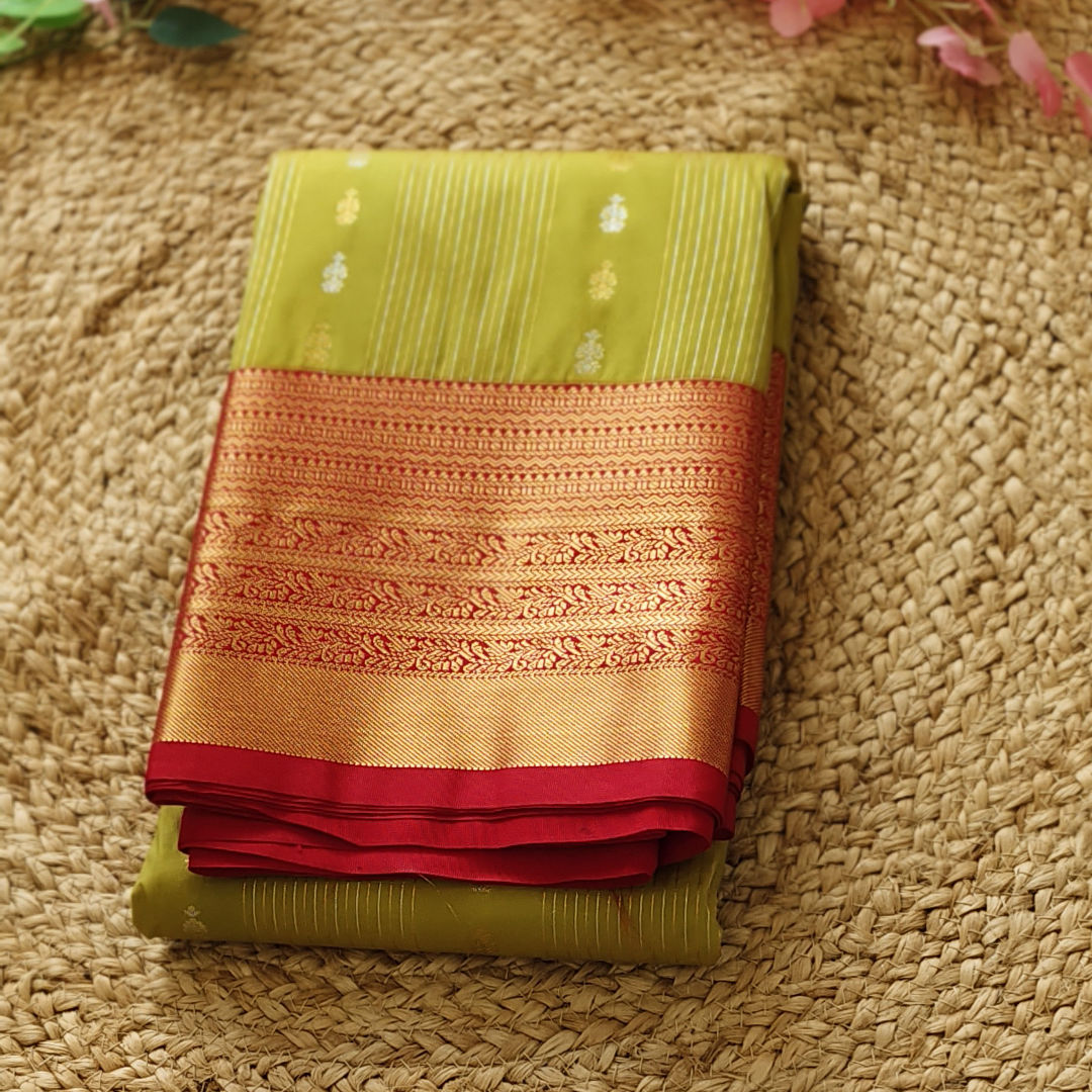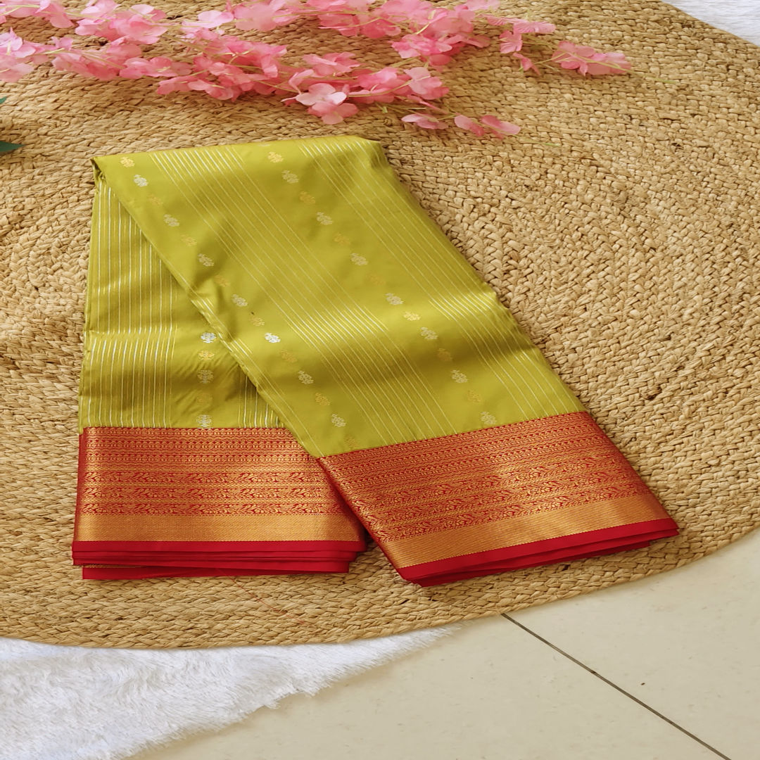 Bring home a timeless piece of South Indian tradition with this Kanchi Semi-Silk Saree, a harmonious blend of vibrant color and intricate craftsmanship. The saree body is a fresh lime green, adorned with vertical zari stripes and delicate floral buttas in gold, lending a subtle yet sophisticated shimmer.