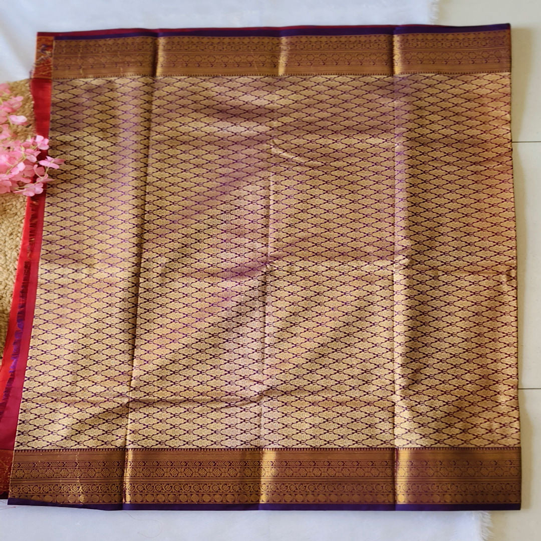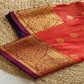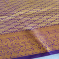 The pallu is a magenta masterpiece, woven with lavish gold zari work in grand floral and paisley patterns, showcasing the richness of Kanchipuram artistry. The borders are richly detailed with temple-inspired motifs in gold zari, beautifully contrasting with the rust-orange base and adding a dramatic touch of grandeur.