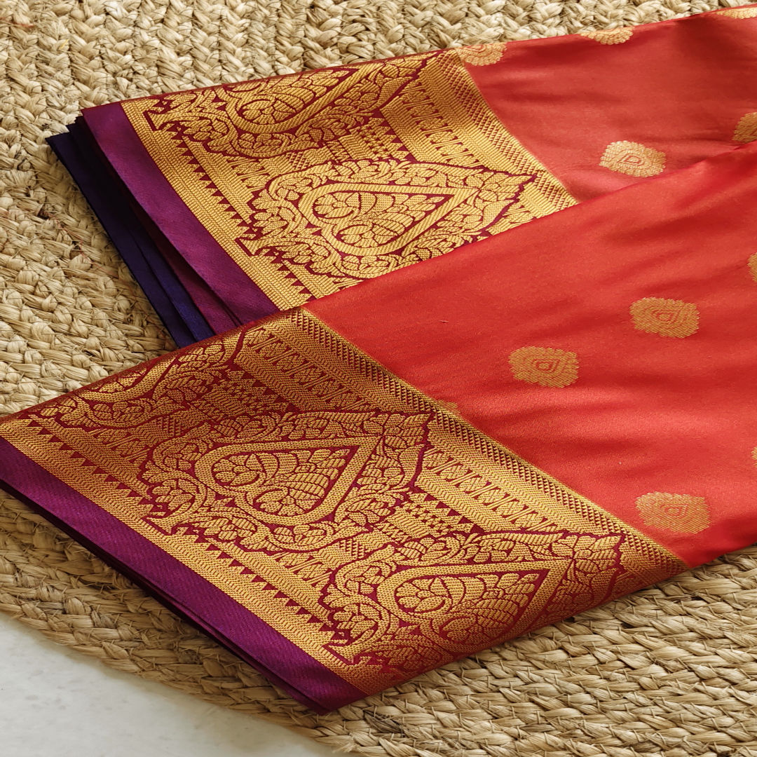 Drape yourself in regal elegance with this stunning Kanchi Semi Silk Saree, a true blend of tradition and grace. The body of the saree features a sophisticated rust orange base, adorned with intricate gold zari buttas in elegant diamond motifs that give it a refined yet festive appeal.