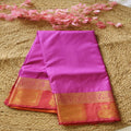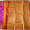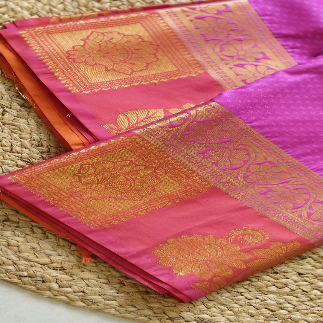 Turn heads and make a statement in this stunning Kanchi Semi Silk Saree, a perfect blend of traditional elegance and contemporary charm. Crafted with precision, this saree features a vibrant pink body adorned with delicate gold zari buttas, offering a soft shimmer that catches the light beautifully. The true showstopper is the contrasting orange pallu, exquisitely woven with intricate floral and paisley motifs in opulent gold zari, adding richness and grandeur to your drape.