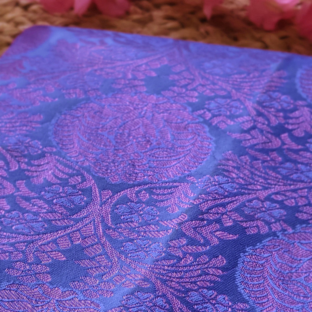 Step into a world of elegance with this exquisite semi-silk saree, where rich textures meet radiant tones. The body of the saree glows in a soft lavender violet, gently transitioning into a deeper toned pallu—creating a graceful gradient effect that catches the light with every movement.
