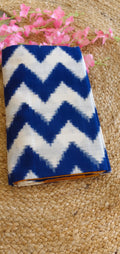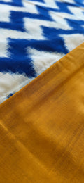 Step into elegance with this stunning Pochampally Double Ikat Cotton Saree, a true masterpiece of handloom craftsmanship. The bold blue and white zigzag patterns, created through the intricate double ikat technique, showcase the unparalleled skill of Pochampally weavers. Complementing the striking body, the mustard-hued borders add a warm, earthy charm, making this saree a unique blend of vibrance and tradition.