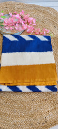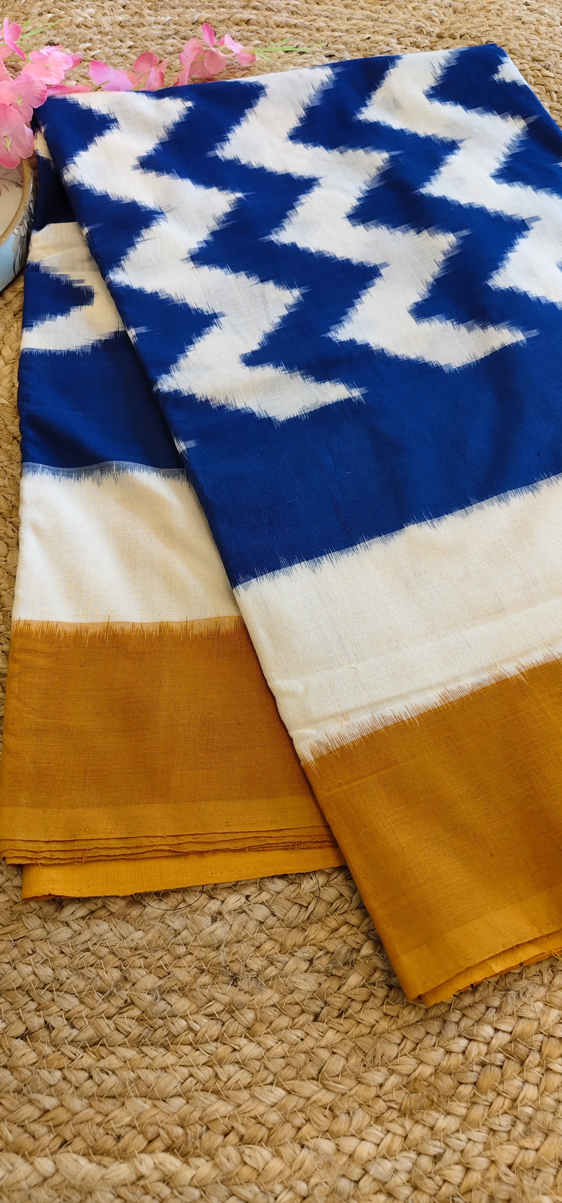 Zigzag Elegance - White, Blue & Mustard Yellow - Double Ikat Cotton Saree